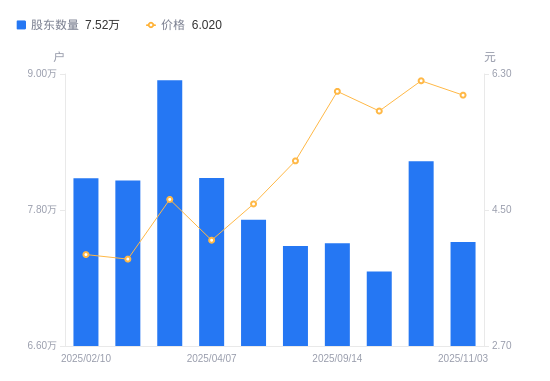日期A股户数(户)流通A股户均持股数(股)户均持股市值(万元)2025-11-037518627519.8416.572025-09-308230925138.2815.612025-09-217257028511.8716.572025-09-147507027562.3616.732025-08-317483325735.9013.252025-06-307713224968.8211.442025-04-078083423825.309.772025-03-318945321529.689.992025-02-288060523892.999.202025-02-108080123835.049.32
