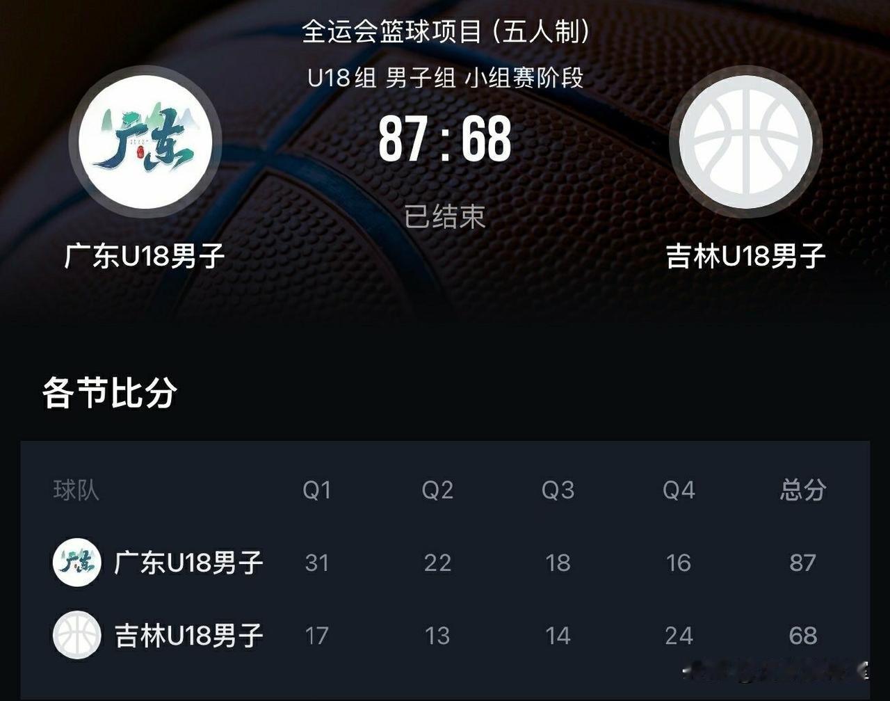 广东U18男篮不讲武德!可以赢吉林22分,但是偏偏只赢19分,导致辽宁被淘汰! 上半场结束时,广东U18男篮就以53:30领先吉林U18男篮,下半场回来广东继续扩大优势,第三节领先到30分,随后广东换下主力派上替补阵容,结果让吉林追至15分分差,随后广东再上主力稳住局面,不过最后吉林凭借着一记三分缩小差距,最终广东以87:68战胜吉林,刚好广东只赢吉林19分,就是这三分之差导致辽宁U18男篮小组赛被淘汰,无缘晋级全运会男篮八强,反而保送吉林U18男篮全运会小组赛出线,与广东同时晋级全运会男篮U18组别1/4决赛。
