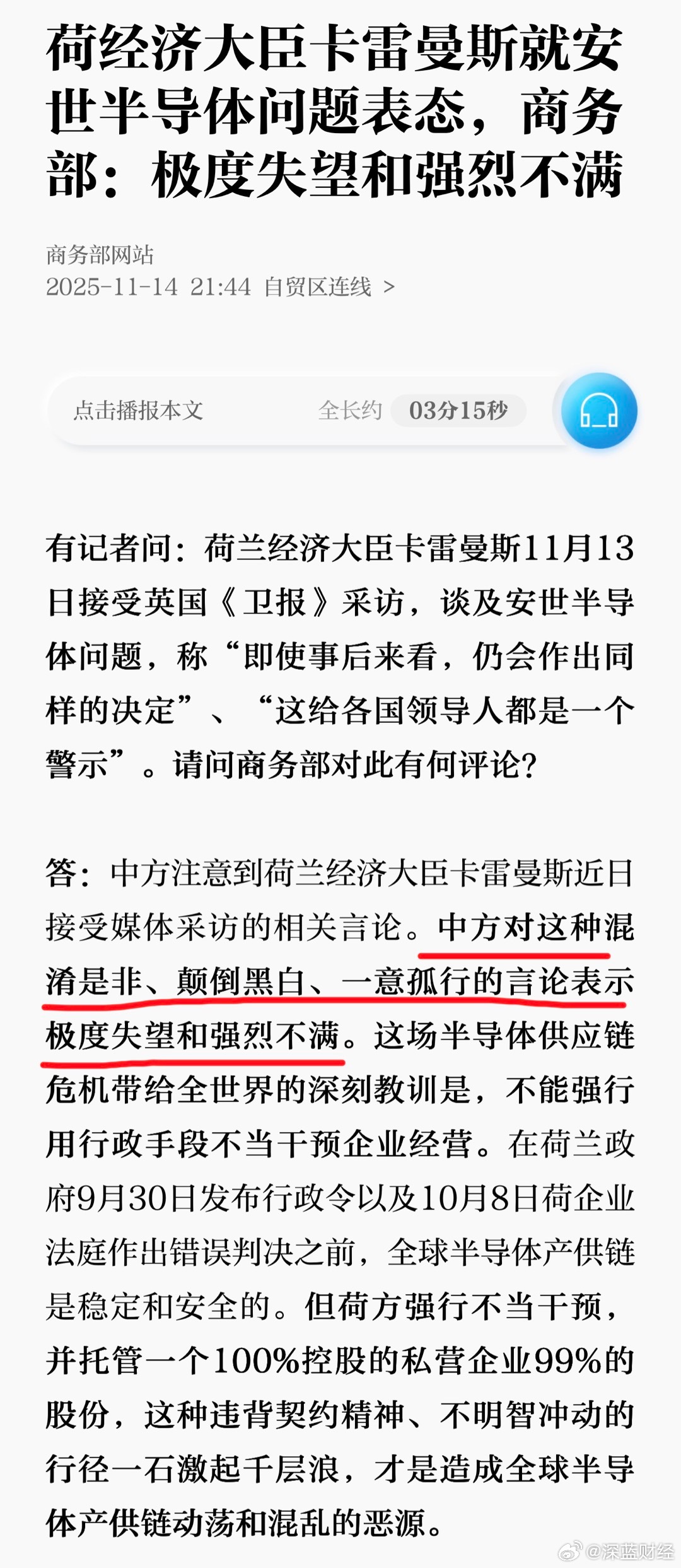 荷经济大臣卡雷曼斯就安世半导体问题表态“即使事后来看,仍会作出同样的决定”。