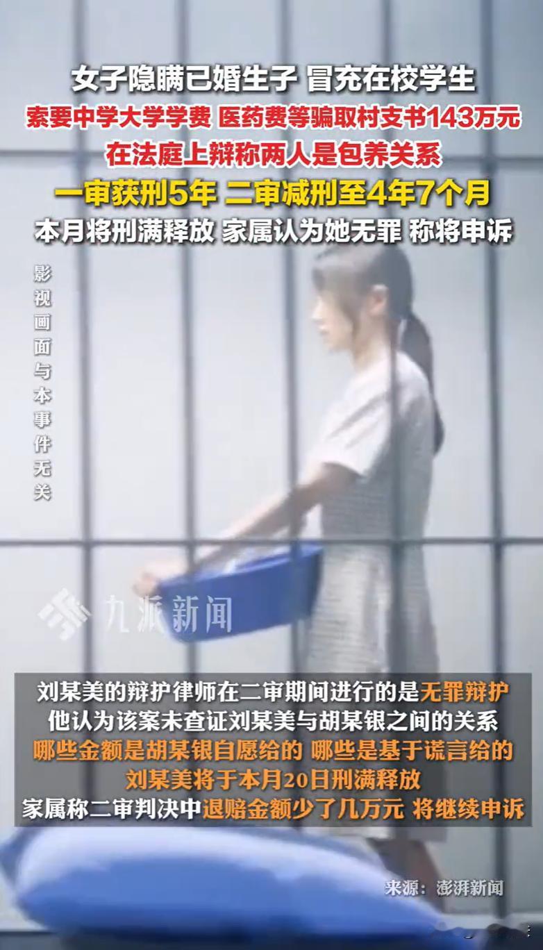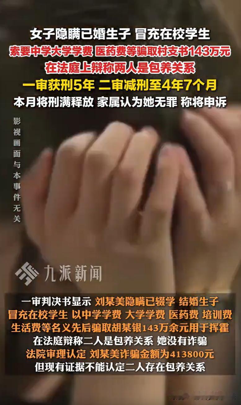 山东临沂,19岁女子与他人订婚后,在某宾馆以“学生”身份从事皮 肉生意。期间,女子假扮在校学生与某村支 书相识,两人发生关系后保持往来。此时,女子已怀孕在身,次年登记结婚,却向男子谎称单身在读大学生。此后,女子持续精心编造“需要手术费”、“在韩国治疗”等谎言,甚至虚构住院细节,先后骗取41万余元,实际这些钱款均被她和丈夫挥霍一空。男子察觉异常报警,女子因涉嫌诈骗罪被移送司法程序。庭审中,女子辩称双方系“包 养关系”,但法院这样判决。 据悉,刘某美出生于1997年,小学毕业后便在家务农,在19岁时即2016年并与卜某洲订下亲事。 同年,刘某美因吸 毒被公安机关治安拘留,还通过某种特殊的渠道,在某宾馆,以“学生”的身份,从事非法交易。 期间,经人介绍,刘某美认识了胡某银,胡某银并非普通村民,曾担任某村的村 支 书,在当地具有一定身份和影响力。 刘某美与胡某银刚认识,就发生了关 系,并互相添加了联系方式。 此后,刘某美与胡某银始终保持联系,交往中,刘某美向胡某银谎称自己正在广州、北京等地读大学,胡某银对此。 与此同时,刘某美怀孕,并与卜某洲正式登记结婚,组建了家庭。 数年间,刘某美变着法向胡某银要钱,主要围绕着那个被虚构的“学生”身份展开,中学学费、大学学费、医药费、培训费、生活费……甚至,她将谎言编织得更加具体和紧迫。 例如,在2019年8月,刘某美谎称在广州读大学期间需要住院动手术,成功从胡某银处获得了十几万元的转账。 到了2020年2月,刘某美又将“病床”搬到了国外,声称在韩国住院治疗,再次索要了一二十万元。 2020年,胡某银察觉到了异常,意识到自己可能坠入了一个精心编织的骗局,于是,他选择了向警方报案。 2021年2月21日,刘某美因涉嫌诈骗罪被刑事拘留,同年3月30日被正式执行逮捕。 随后,检察院以诈骗罪对刘某美提起了公诉,指控诈骗金额超143万元。 庭审中,刘某美坚称自己没有编造理由进行诈骗,其与胡某银为“包 养关系”,双方之间的钱财往来属于这种特殊关系下的赠与或交易,不应认定为诈骗。 法院会如何判决呢? 《刑法》第二百六十六条规定,诈骗公私财物,数额较大的,处三年以下有期徒刑、拘役或者管制,并处或者单处罚金;数额巨大或者有其他严重情节的,处三年以上十年以下有期徒刑,并处罚金;…… 一审法院指出,刘某美在侦查阶段、庭审中的供述稳定且清晰,其承认在结识胡某银时,即由他人将其包装为“学生”身份进行非法交易。此后,在长期交往中,刘某美隐瞒自己已辍学、结婚生子的事实,虚构在读大学生、治疗疾病等事实,向胡某银索要钱财。 胡某银因刘某美精心编织的谎言,自以为在“资助一名大学生完成学业”和“救助一名患病学生”,基于此种同情和帮扶心理向刘某美赚钱。 在拿到钱后,刘某美将所获钱款用于与前夫共同消费挥霍,并未用于其所声称的学业、医疗等正当用途,且至今无法归还。 刘某美以其与胡某银存在“包 养关系”为由试图混淆为赠与或交易,但是,胡某银并非基于“包 养”的合意,而是基于被欺骗产生的错误认识处分财产。 经过核算,刘某美诈骗金额并非公诉机关指控的143万余元,而是41.38万余元,但也达到了数额巨大标准。 一审法院认为,刘某美的行为构成诈骗罪,而其所提“包 养关系”的抗辩意见,与查明的事实及法律规定不符,不予采纳。 最终,一审法院判决刘某美犯诈骗罪,判处有期徒刑五年,并处罚金人民币十万元;同时责令刘某美在判决生效后三十日内,退赔被害人胡某银经济损失人民币413800元。 一审判决后,刘某美不服判决,提起了上诉。 在二审阶段,刘某美的辩护律师为她作了无罪辩护,理由是,案件中针对诈骗金额等关键事实并未查证清楚,未达到“事实清楚,证据确实、充分”,并且能够“排除合理怀疑”的严格证明标准。 二审法院认为,一审判决认定刘某美犯诈骗罪的事实清楚,证据确实、充分,定性准确,且一审判决对诈骗金额进行了从严把握,无明显问题。 不过,考虑到辩护人所提关于部分款项时间、细节在证据上存在的微小瑕疵,以及本案发生于特殊关系背景等因素,可在量刑上予以酌情从轻。 最终,二审法院基于罪责刑相适应的原则,对刘某美刑期作出微调,由五年改判为四年九个月,并对退赔金额予以相应核减。 据家属透露,刘某美将于11月20日刑满释放。 然而,尽管获得了三个月的减刑,但刘某美及其家属不接受这个结果,坚信自己无罪,表态将继续申诉,寻求救济。 值得一提的是,刘某美和胡某银之间存在非法交易,属于治安违法,依法应当处以拘留及罚款处罚。 而胡某银作为村 支 书,视情节轻重,依法应受到警告直至开除公职的处分。 对此,您怎么看?