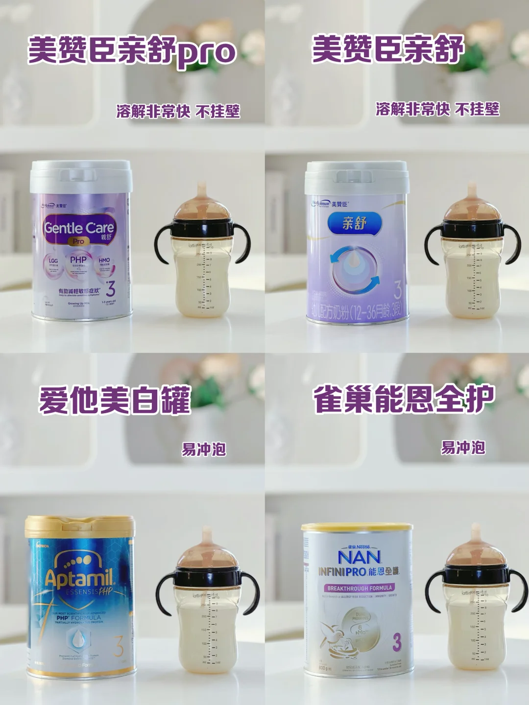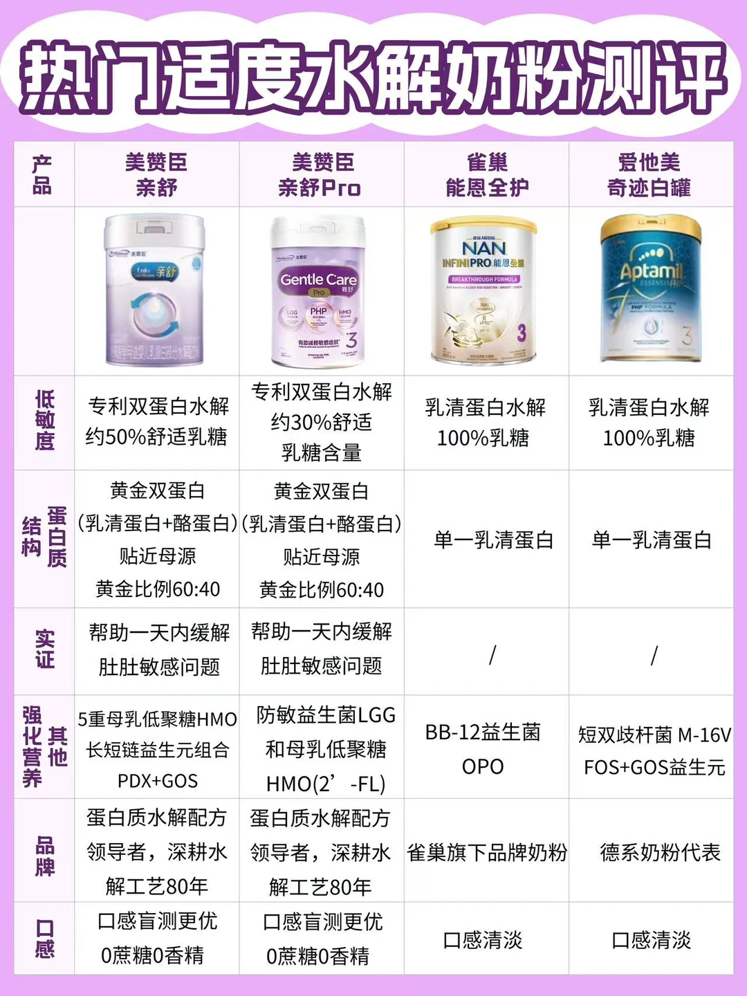 这次转奶,[哇R]我真是拼了老命做功课![得意R]深挖了4大热门适度水解奶粉:美赞臣亲舒、美赞臣亲舒pro、雀巢能恩全护、爱他美奇迹白罐。