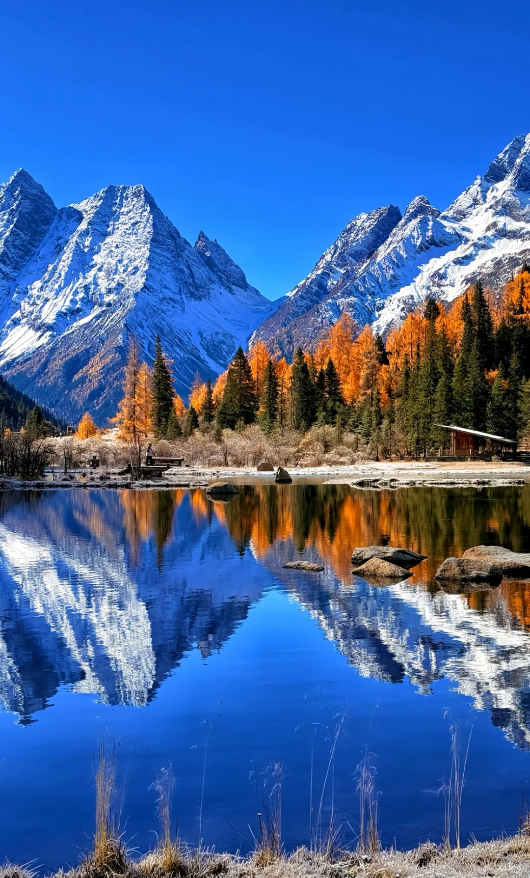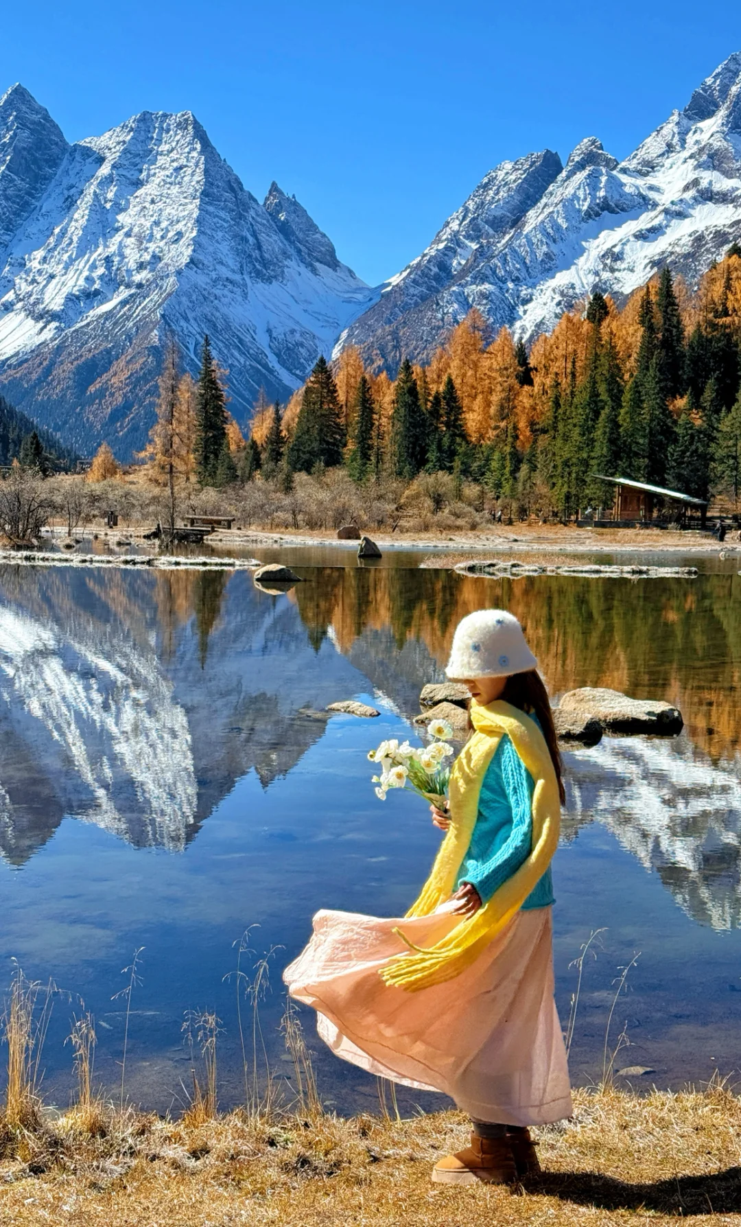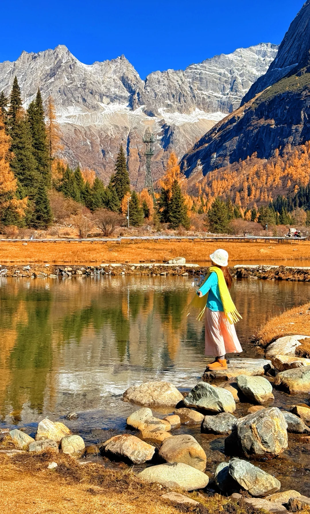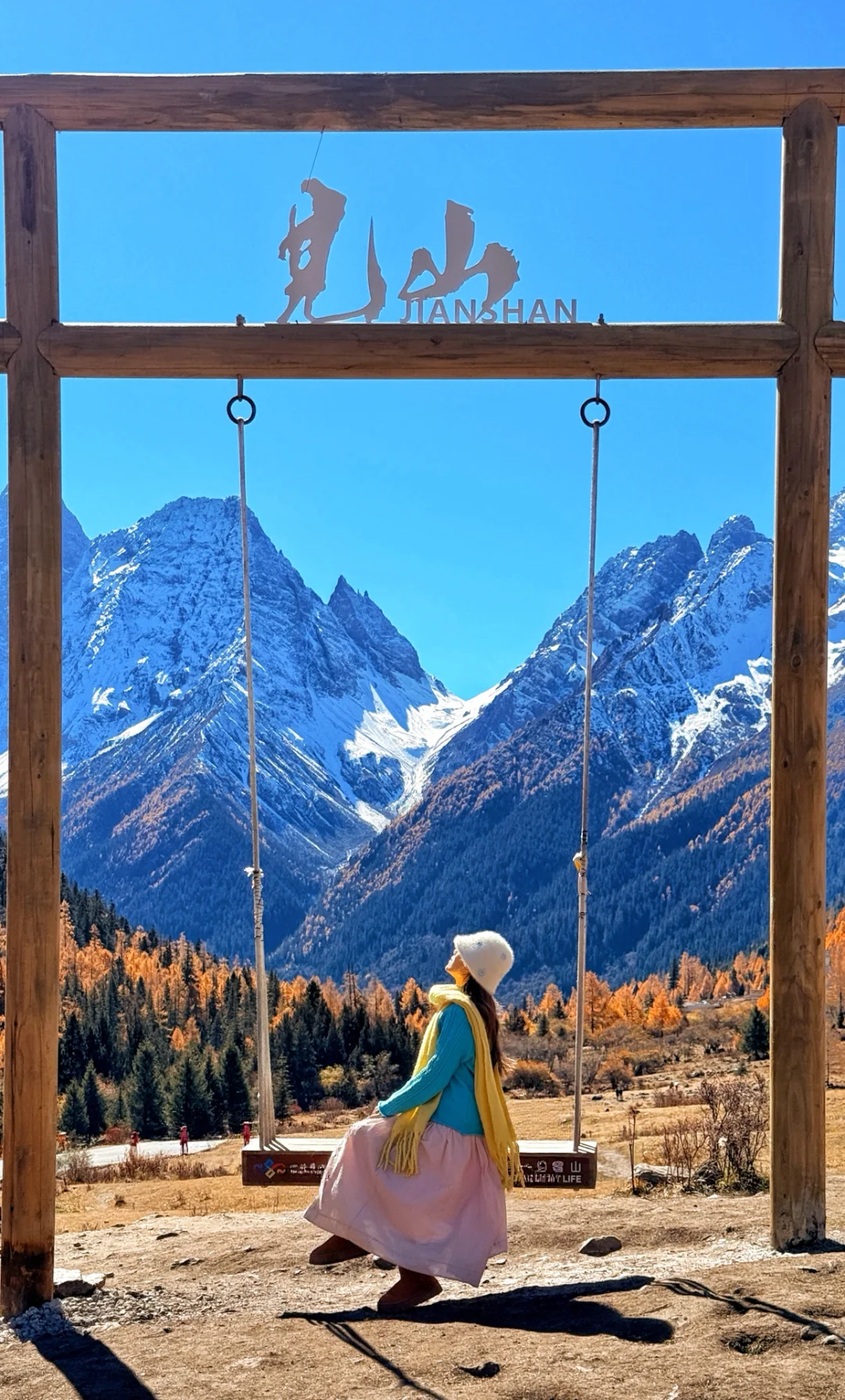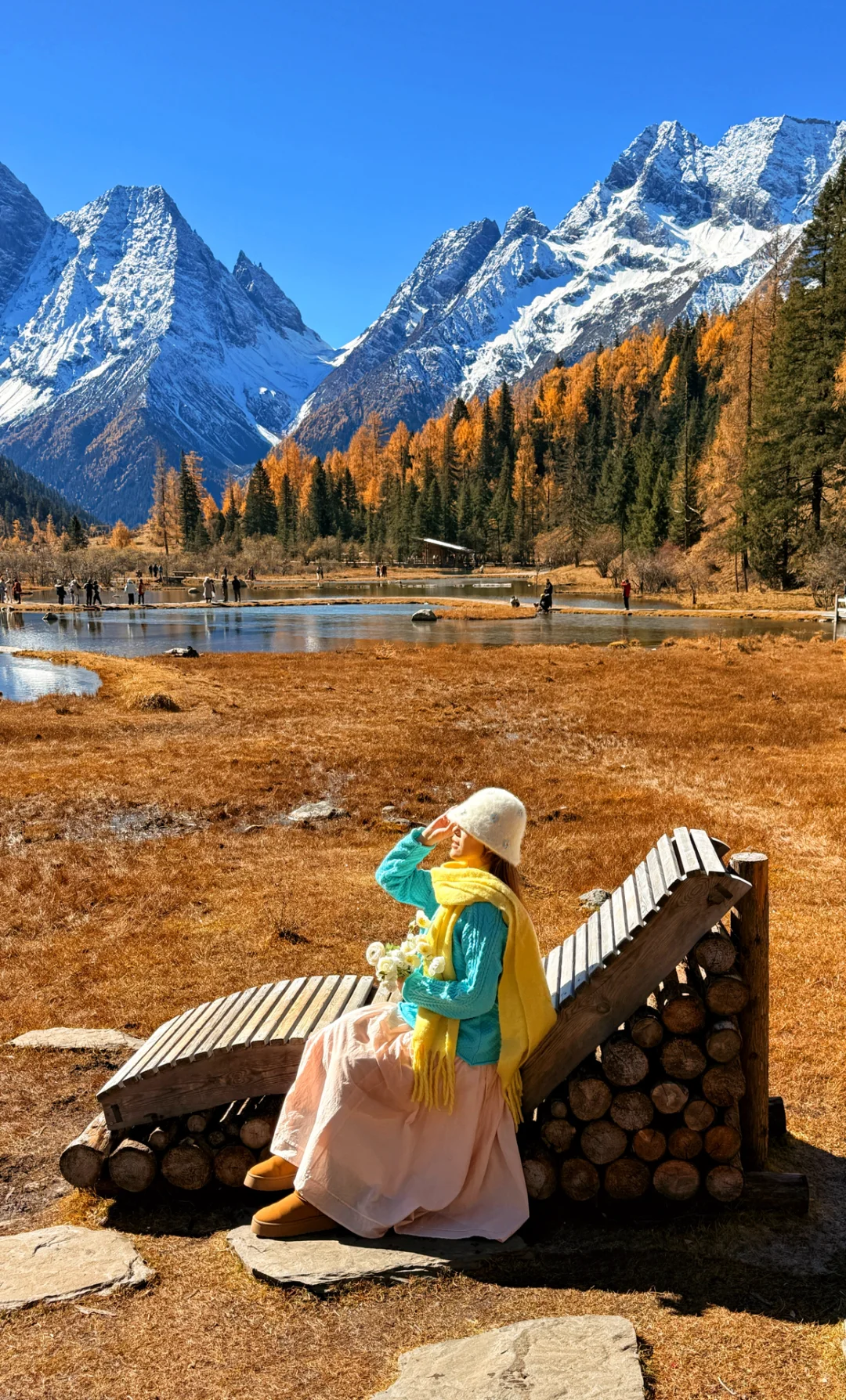 - 姐妹们!听我说🥹 四姑娘山拍这一个机位就够了 真的很美很美很美! 我爱雪山🏔️😍 - 运气好到爆炸,连着几天都是大晴天🦋 晴天不加任何滤镜都美的我大吃一惊🍁 - 秋天来的好处就是可以看到彩林和雪山同框 🅾️分享一个必打卡点位 👍可以拍到雪山,彩林,湖泊 🩵珠噶纳措 从布达拉峰下车☝️往回走☝️红杉林方向徒步1km,会看到一个木栈桥,沿着木栈桥一直一直往前走,这里可以拍到雪山彩林倒影,时间最好在早上10:30左右,太阳完全照过来就看不到水面倒影了 . 🩵布达拉峰 网红基伟拍完往回走,可以看到雪山白塔和彩林,可以拍雪山公路大片,这里有秋千,相框可以拍照打卡 - 主要还是天气很重要,祝接下来去打卡的小伙伴全都豪赌成功,毕竟去一次确实太辛苦了、也很考验体力[哭惹R] . ps:千万不要在景区附近吃饭!一定要听劝❗️ .