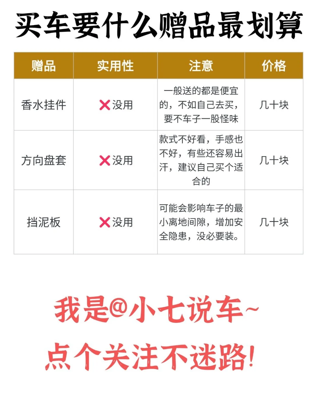 姐妹们谈完车价是不是觉得大功告成啦,其实要赠品也是很关键的,✔️尤其是当价格砍不下来的时候,选择好的赠品可以再给我们拉回一把价格!👀所以咱们要了解好赠品的价值,⚠️千万别选了一堆劣质又没啥用的赠品,就得不偿失啦!小七总结了一份选赠品攻略,送给要买车的姐妹,一定要马住🐎哦,买车的时候能用上~ ✅全车贴膜 4S店的一般比较劣质,送的时候问下什么品牌,然后去网上查一下,靠谱的可以,便宜的还不如送点别的实用的 - ✅全车脚垫 最好是全包脚垫,很多送的是丝圈脚垫,吸尘性好但覆盖率小,长时间容易滋生细菌 - ✅后备箱垫 劣质的尽量不要,有味儿还容易滋生细菌 - ✅灭火器 关键时刻保命的,一定要! - ✅行车记录仪 尽量争取原厂的,杂牌的不好用还容易烧卡和断录,实在不行自己买好让4S店帮忙装,要不工时费也要钱 - ✅加油卡 真金白银,往死里要,能要多少就多少 - ✅保养卡 要说清楚包含工时费,还有保养的项目,有些是送基础保养不含工时 - ✅底盘装甲 多喷一些保护底盘(防锈、剐蹭、碰撞、腐蚀等),一般需要4瓶 - ✅香水挂件 一般送的都是便宜的,不如自己去买,要不车子一股怪味 - ✅方向盘套 款式不好看,手感也不好,有些还容易出汗,建议自己买个适合的 - ✅挡泥板 可能会影响车子的最小离地间隙,增加安全隐患,没必要装