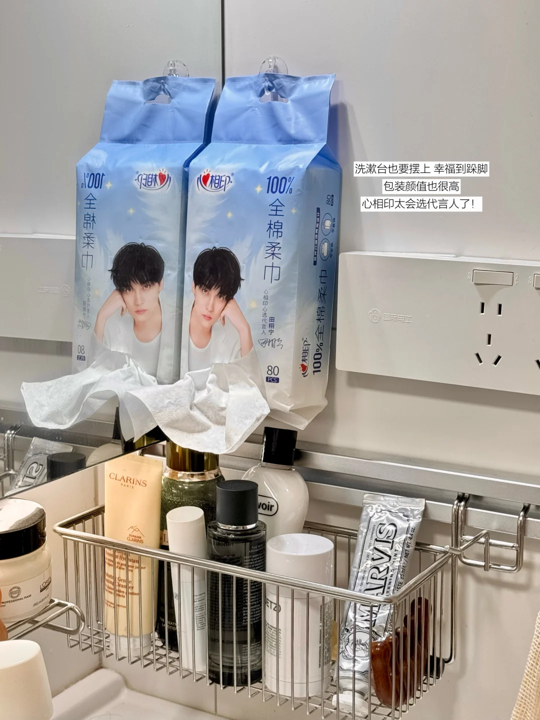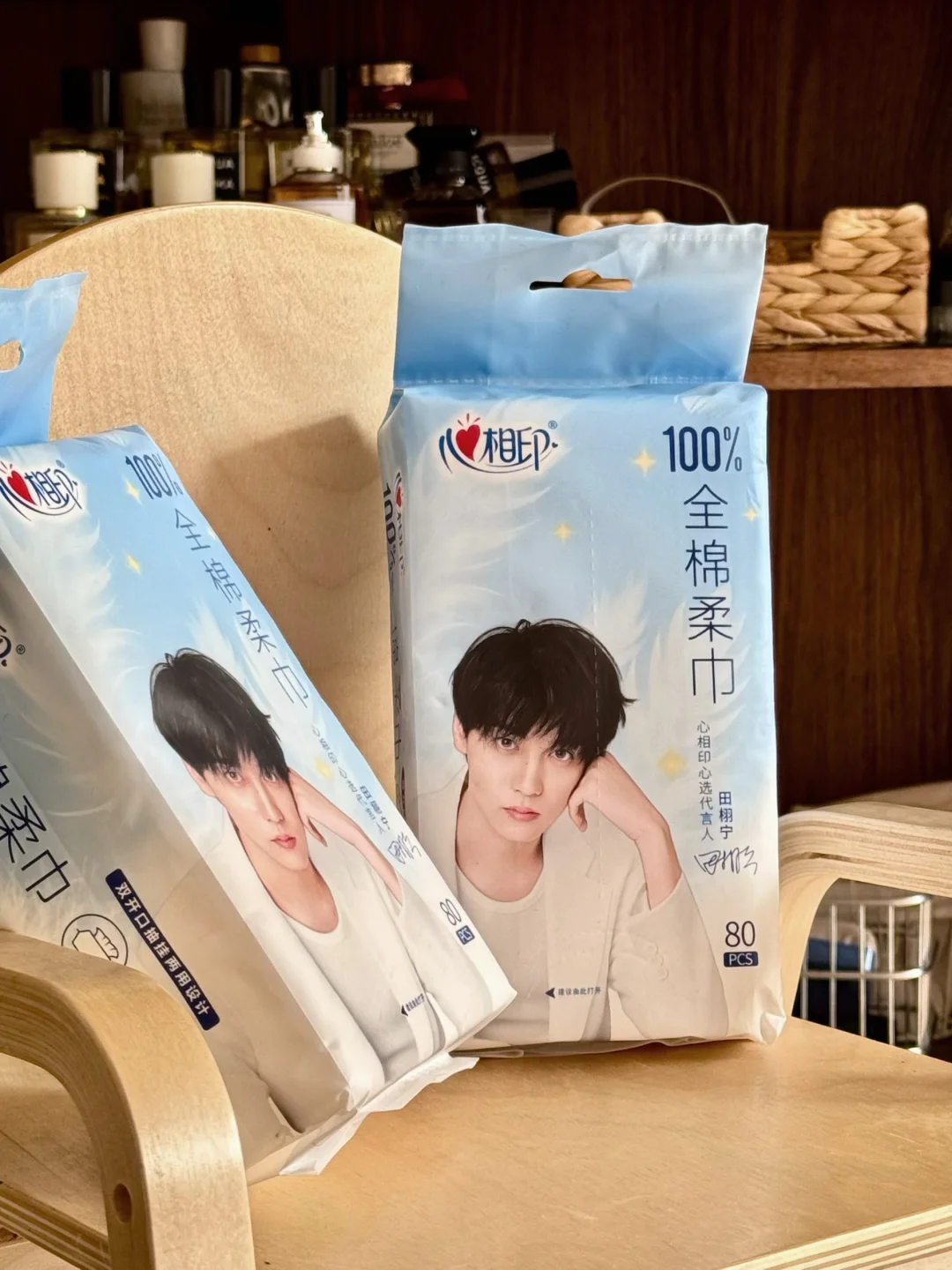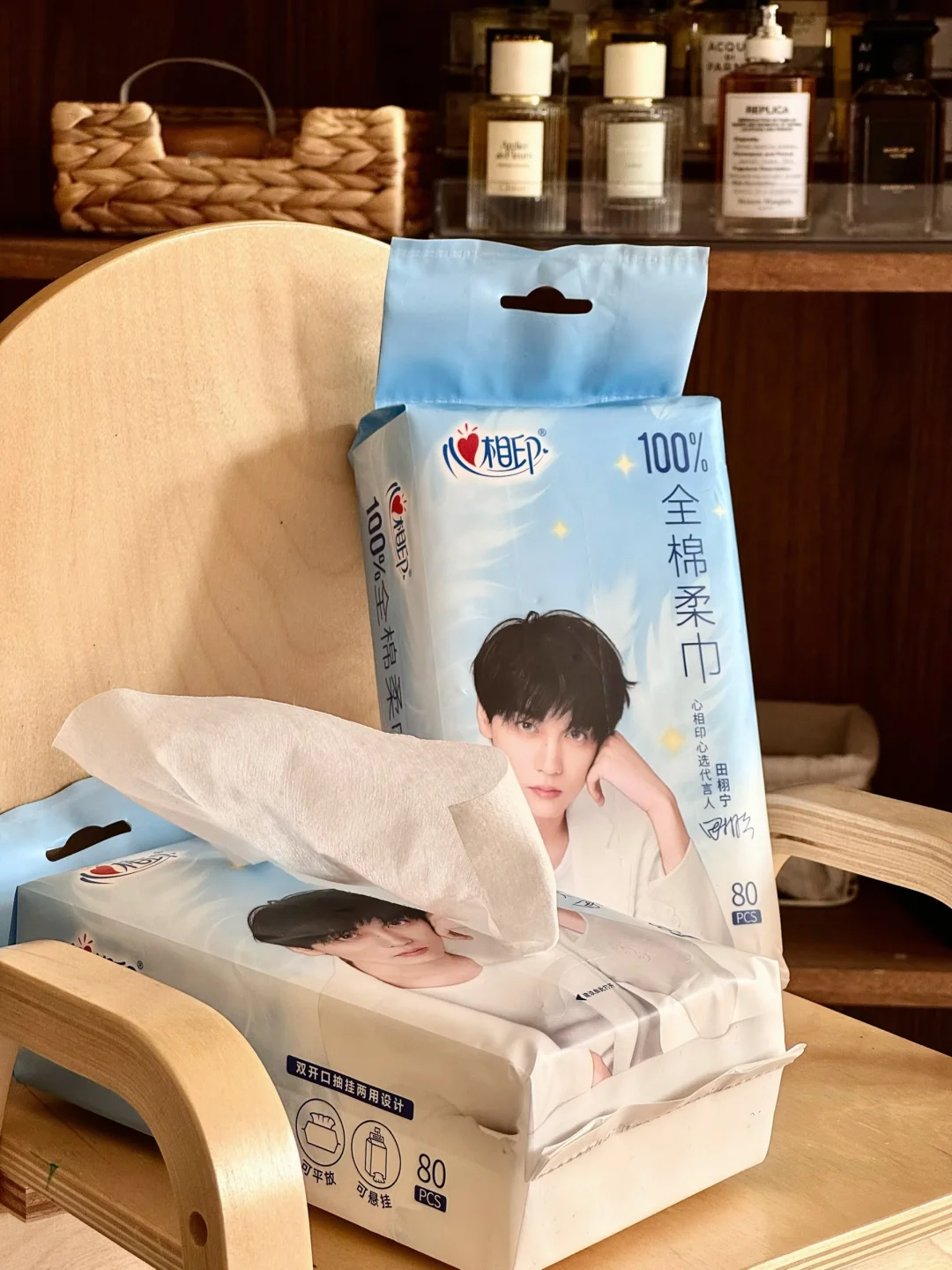 心相印你也太懂我了!这波心相印×田栩宁的定制100%全棉柔巾,直接承包了我一整天的心动~ 先是被包装上的哥帅到——这张权威的脸脸印在棉柔巾外包装上,跟摆了个mini立牌在化妆台似的,每次抽棉柔巾都像和哥对视,幸福到跺脚! 再说这棉柔巾本身——细腻柔软!100%全棉材质,我敏感肌平时用来擦脸敷脸都很舒服,每次用它都像在和哥贴贴~不管是摆在化妆台,还是挂在洗漱间,怎么放都好看! 本来是冲哥的联名买的,结果现在洗脸擦手全靠它,我已经囤了三箱慢慢用~
