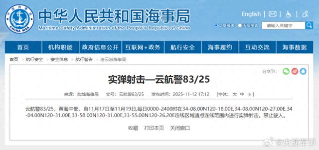 据中国海事局网站消息,盐城海事局发布航行警告,11月17日至19日,每日0时到24时,黄海中部部分海域进行实弹射击,禁止驶入。