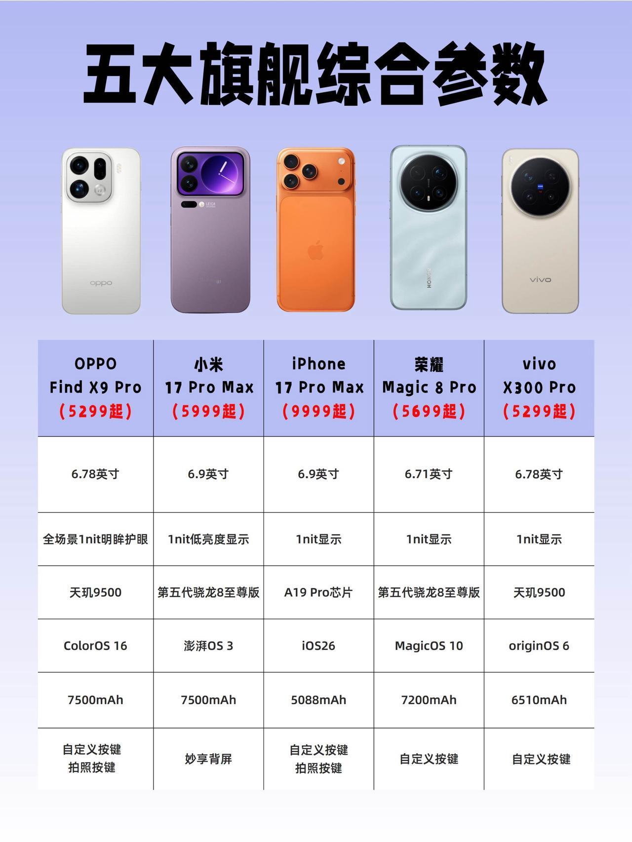 大杯旗舰集合 | 别再问市场中有哪些高端机了! 年底换机纠结症犯了?这五台大杯旗舰各有绝活,老司机帮你捋清楚,按需选不踩坑! 📸 OPPO Find X9 Pro 核心配置:哈苏四摄(2 亿超清长焦 + 超动态大底主摄+Ultra级丹霞),7500mAh 超大电池,全场景 1nit 护眼屏,ColorOS 16 系统丝滑流畅。 👉推荐人群:影像党、长续航刚需户。哈苏色彩还原绝绝子,旅拍能当 “便携相机” 使;大电池出门一天不用愁没电,ColorOS 16 的流畅度和功能更新也很加分。 📸 小米 17 Pro Max 核心配置:徕卡三摄(超高动态主摄 + 超聚光潜望长焦),妙享背屏,澎湃 OS 3 生态互联,第五代骁龙 8 芯片。 👉推荐人群:徕卡色彩爱好者、多设备用户。拍人拍景都有徕卡那味儿,妙享背屏玩交互很新鲜,小米生态里的手机平板联动丝滑到飞起。 📸 iPhone 17 Pro Max 核心配置:4800 万三摄,iOS 26 系统,8 倍光学变焦,专业视频能力拉满。 👉推荐人群:苹果全家桶用户、视频创作者。iOS 生态没的说,视频拍摄的色彩和动态范围很专业,习惯苹果操作逻辑的闭眼入。 📸 荣耀 Magic8 Pro 核心配置:超夜神主摄 + 2 亿超夜神长焦,YOYO 影像智能体,7000mAh 电池,MagicOS 10 系统。 👉推荐人群:夜景摄影党、AI 功能爱好者。暗光环境拍人拍景都很能打,YOYO 的 AI 影像辅助贼实用,大电池续航也很靠谱。 📸 vivo X300 Pro 核心配置:蔡司 三摄,全焦段高清人像,OriginOS 6 系统,6510mAh电池,小V助手。 👉推荐人群:喜欢蔡司影像人群。拍照锐利,人像一眼好看。电池在一众新旗舰中不算突出,但新一代系统有提升。 📝五台机器各有千秋,没有绝对的好坏,只有适不适合自己~不过近期身边看到不少换iPhone的,这一代销量火爆,另外Find X9 Pro也看到好几个在用了,问了下主要说影像调得舒服,续航也更顶~ 大杯旗舰 手机推荐 OPPOFindX9Pro 小米 17ProMax iPhone17ProMax 荣耀 Magic8Pro vivoX300Pro