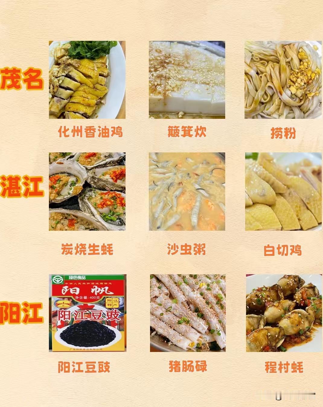 粤西3城的代表食物,你认同吗? 茂名:化州香油鸡、簸箕炊、捞粉; 湛江:炭烧生蚝、沙虫粥、白切鸡; 阳江:阳江豆豉、猪肠碌、程村蚝。 这是排名前三的比较有知名度的食物,除此之外还有很多有特色的小吃。比如阳江还有鹅乸饭、阳春叶贴、玛仔等。 粤西 茂名 湛江 阳江