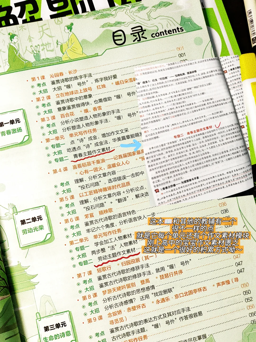 其中它的名师大招册直接链接了很多的真题(新题占比高,像其他的必刷题老题型占比较多),针对这些新题型还讲了很多的解题方法,(这是它跟其他教辅比较不一样的,侧重于讲方法),另外,它还给我们整理了答题的模板,敲级好用,提分有效!里面有个比其他教辅特别的一块就是每小章节后设有作文素材模块,非常适合我们积累作文素材