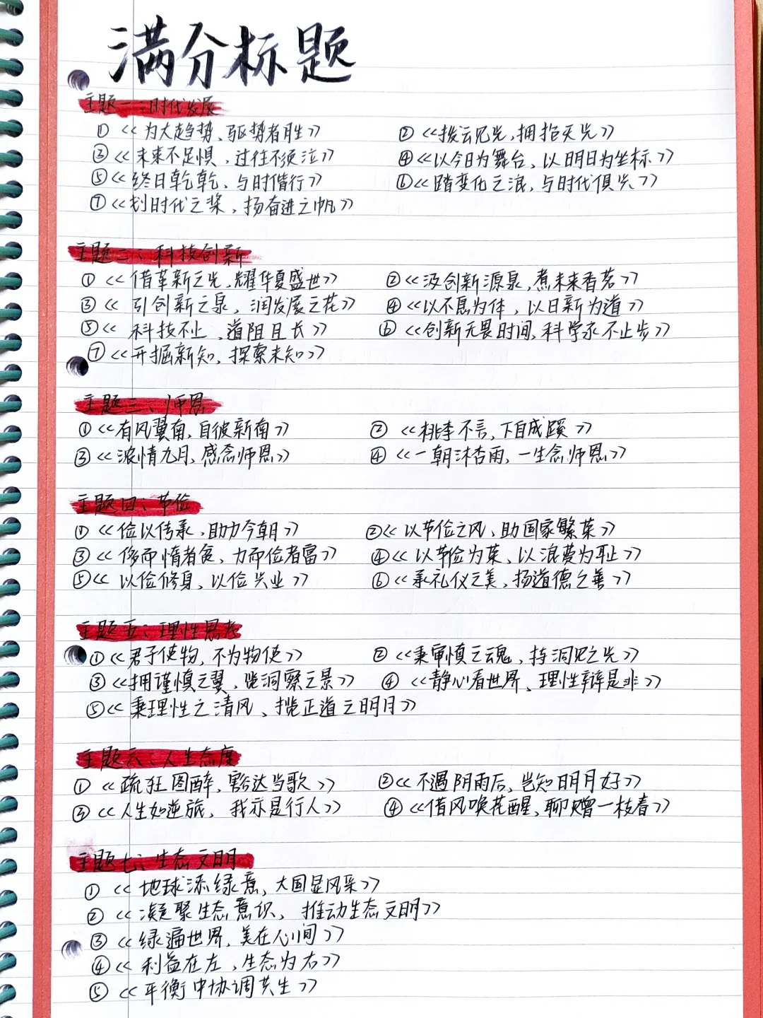 主题一:时代发展 主题二:科技创新 主题三:师恩 主题四:节俭 主题五:理性思考 主题六:人生态度 主题七:生态文明