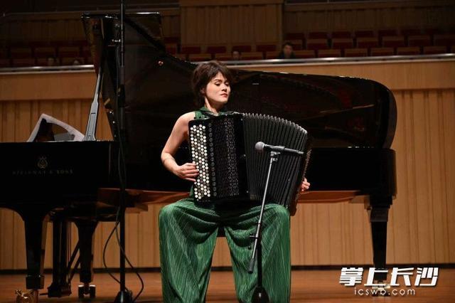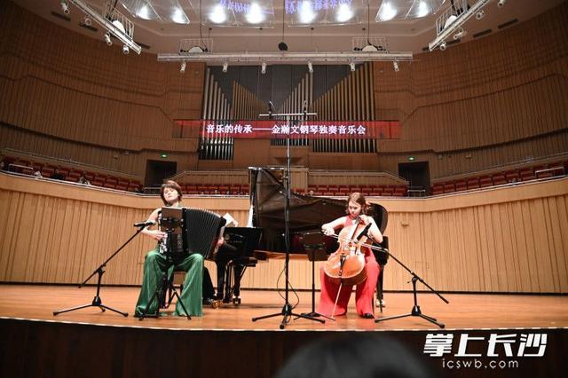 “传承”的主题不仅体现在曲目选择上,更贯穿于演出形式之中。音乐会上,金瀚文的长沙籍学生、浙音管弦系大提琴专业学子彭胡湾与老师携手,深情演绎了皮亚佐拉的经典探戈作品《遗忘》,展现了师徒间的艺术默契。更为惊喜的是,金瀚文的夫人、浙江音乐学院手风琴专业副教授吴雯怡亦登台献艺,一曲《弹起我心爱的土琵琶》为这场西洋乐器音乐会增添了别样的民族风情与温馨的家庭氛围,立体呈现了师生、亲人之间多维度的音乐传承图景。最终音乐会在经久不息的掌声中落下帷幕。