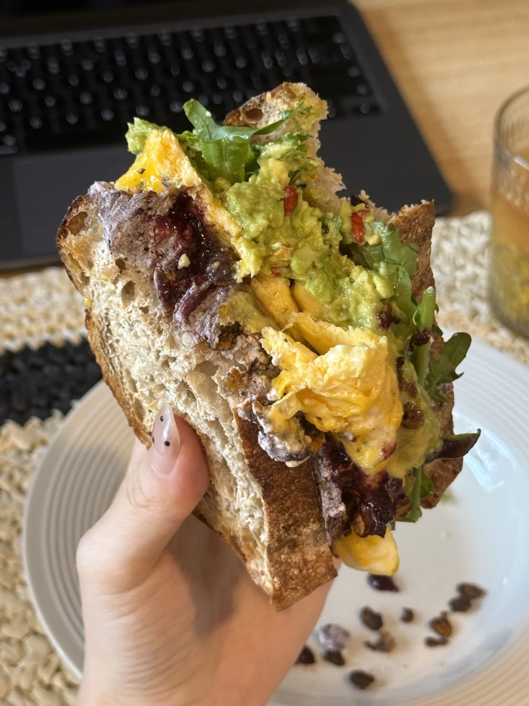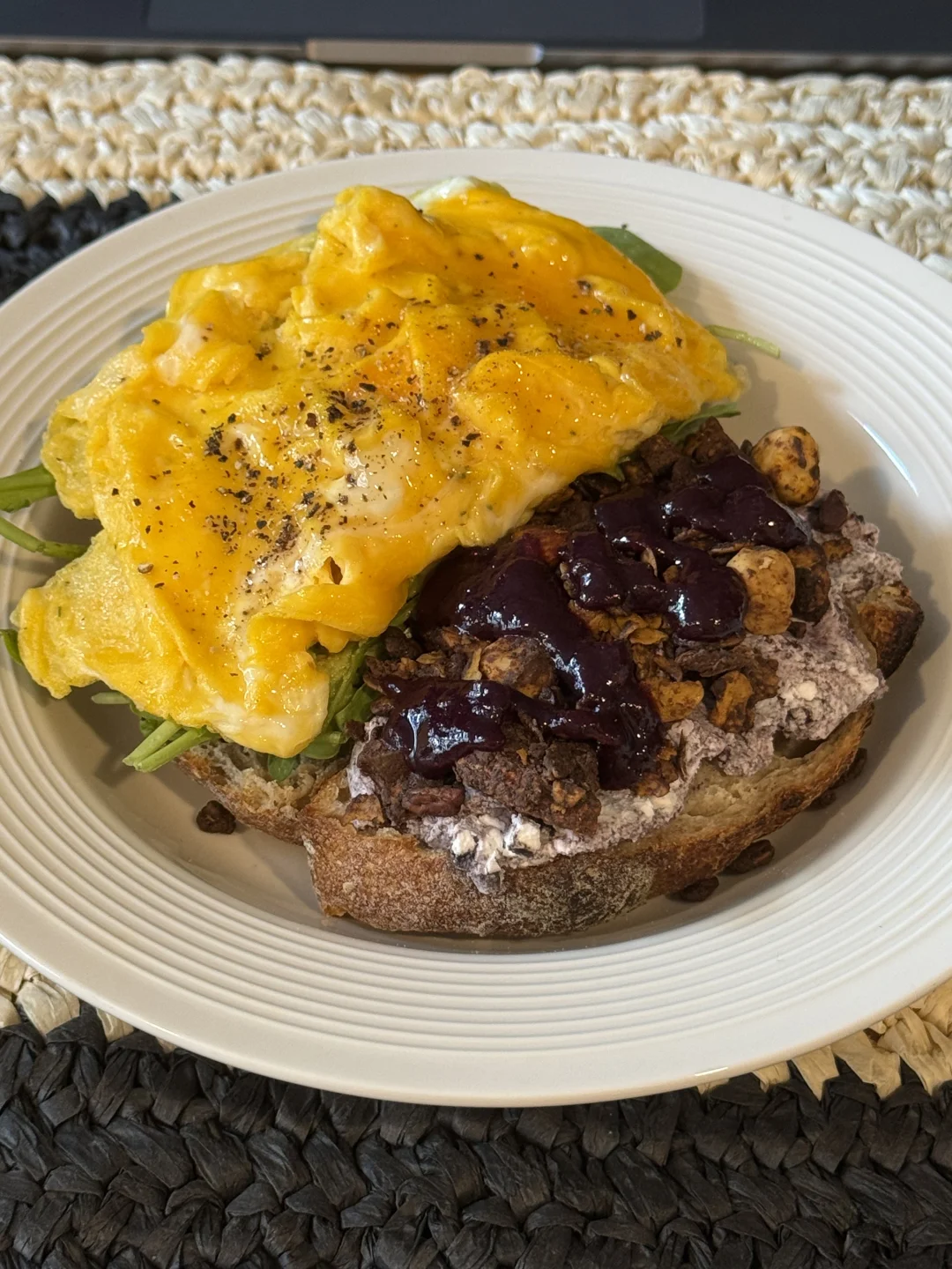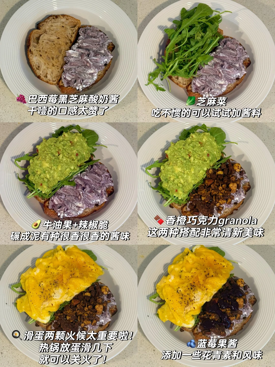 📍佛系养生D388 初始:56.6kg 今早:64kg 【早餐】 🍞全麦乡村烤完再煎了一下很tree 🍇巴西莓黑芝麻酸奶酱,干噎的口感太赞了 🥬芝麻菜,吃不惯的可以试试加酱料 🥑牛油果+辣椒脆,碾成泥有种很香很香的酱味 🍫香橙巧克力granola,这两种搭配非常清新美味 🍳滑蛋两颗火候太重要啦!热锅放蛋滑几下就可以关火了! 🫐蓝莓果酱添加一些花青素和风味 🫗青柑普洱百香果双响炮