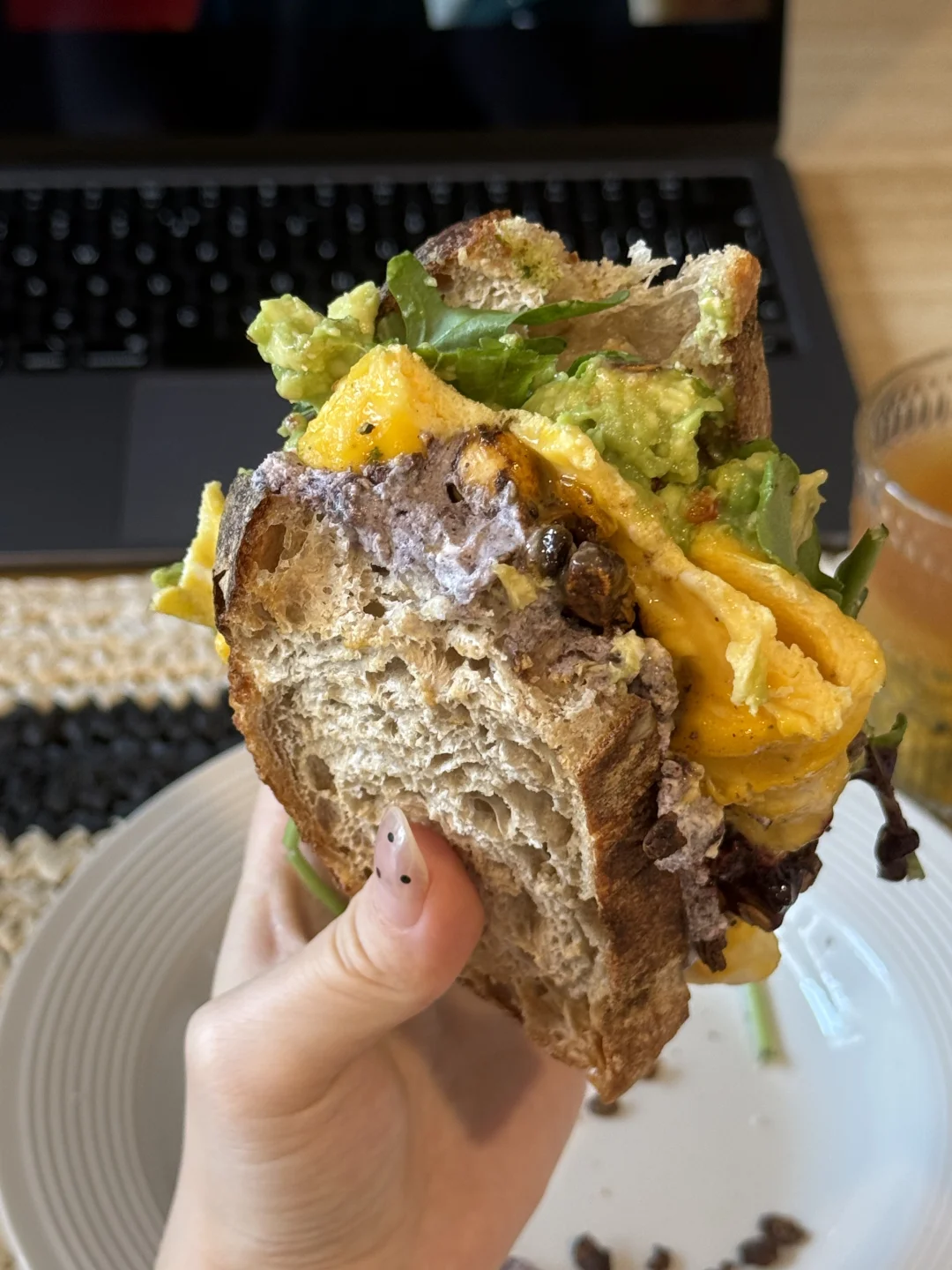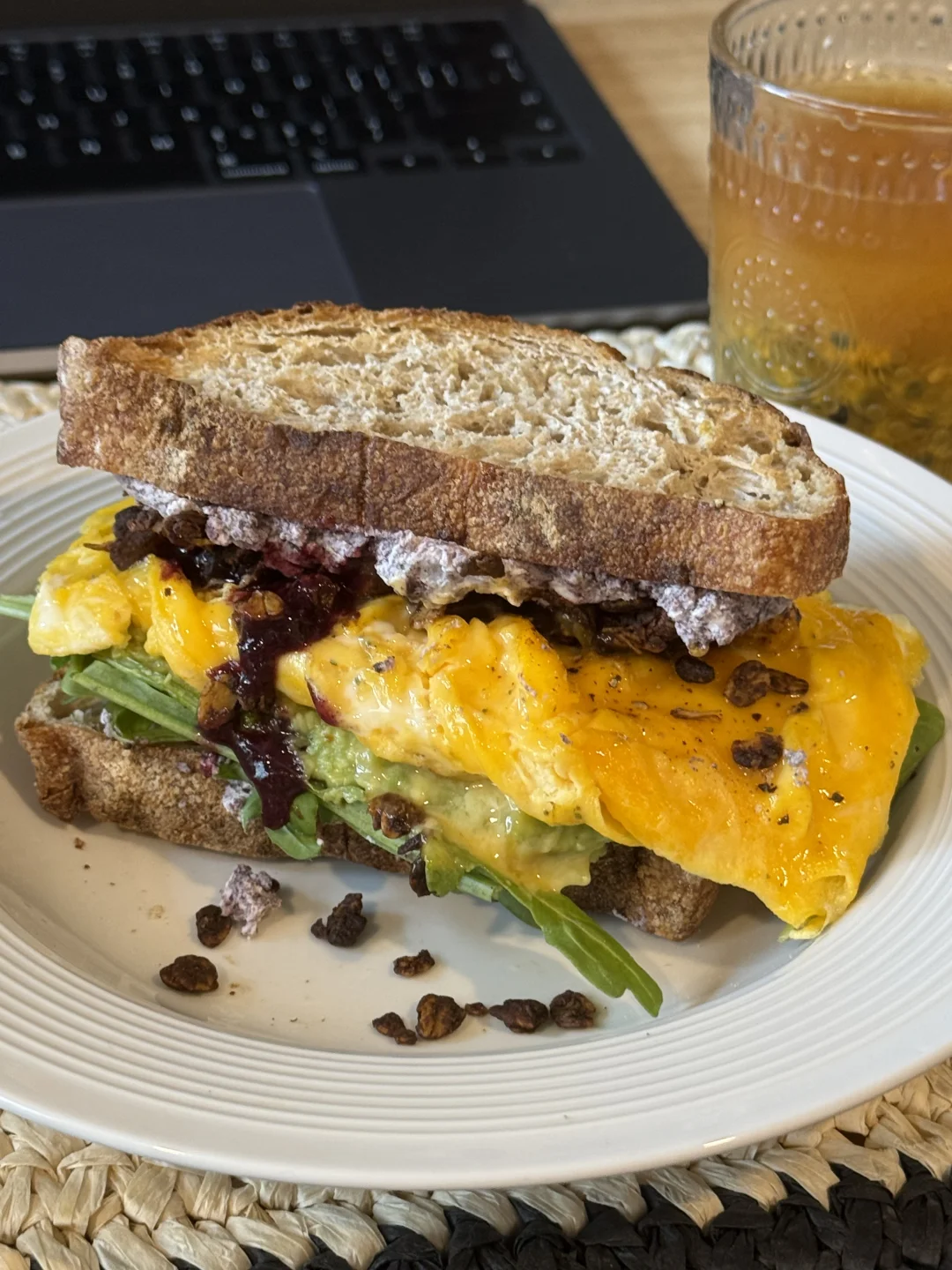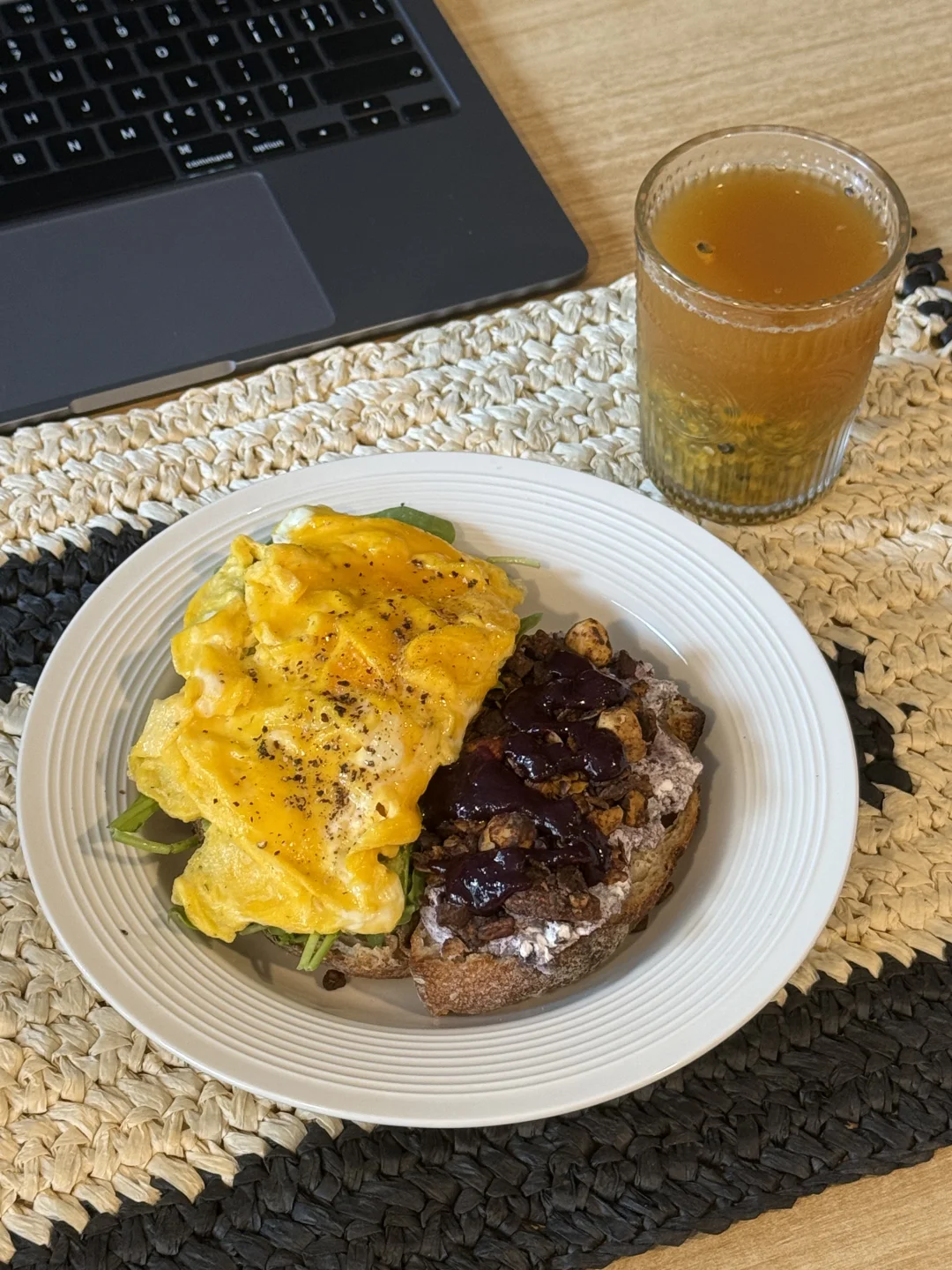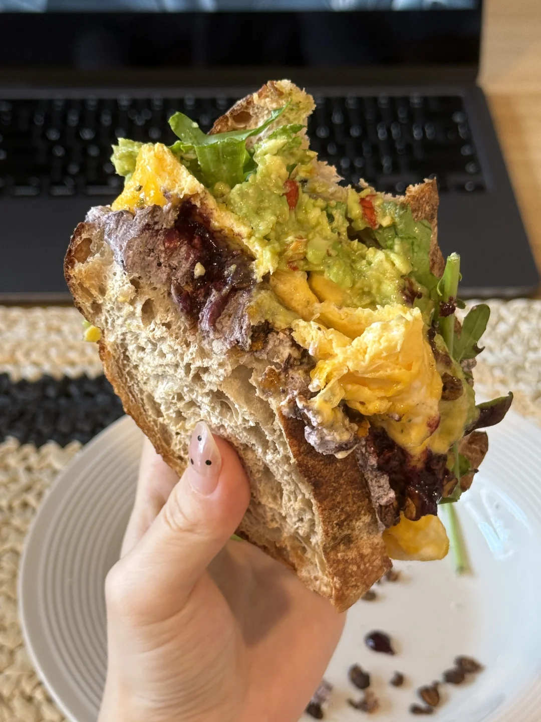 📍佛系养生D388 初始:56.6kg 今早:64kg 【早餐】 🍞全麦乡村烤完再煎了一下很tree 🍇巴西莓黑芝麻酸奶酱,干噎的口感太赞了 🥬芝麻菜,吃不惯的可以试试加酱料 🥑牛油果+辣椒脆,碾成泥有种很香很香的酱味 🍫香橙巧克力granola,这两种搭配非常清新美味 🍳滑蛋两颗火候太重要啦!热锅放蛋滑几下就可以关火了! 🫐蓝莓果酱添加一些花青素和风味 🫗青柑普洱百香果双响炮