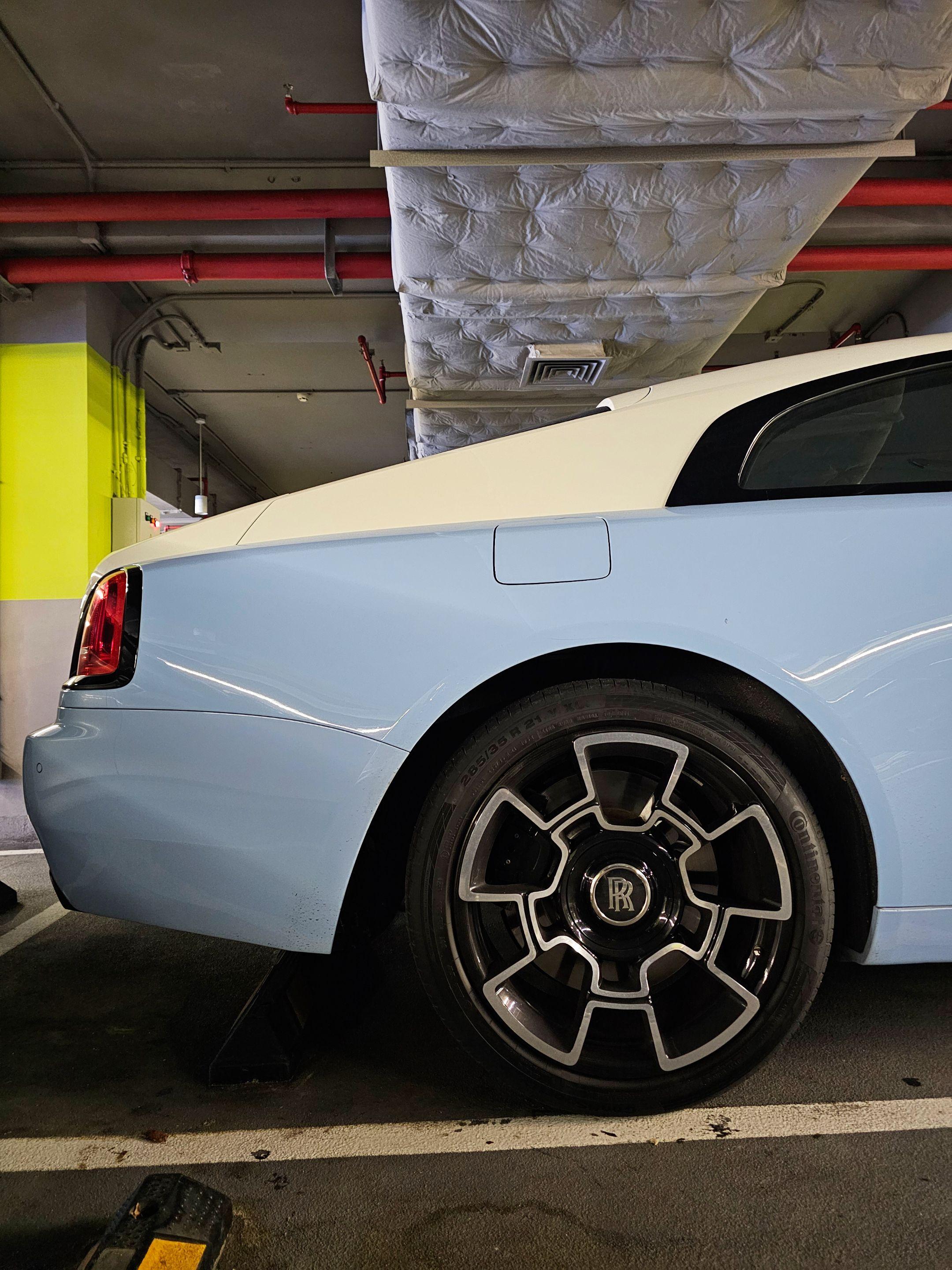 在某地库偶遇大佬座驾劳斯莱斯魅影Black Badge,双拼色的外观黑色套件和碳钎维轮毂,优雅奢华极致永不过时