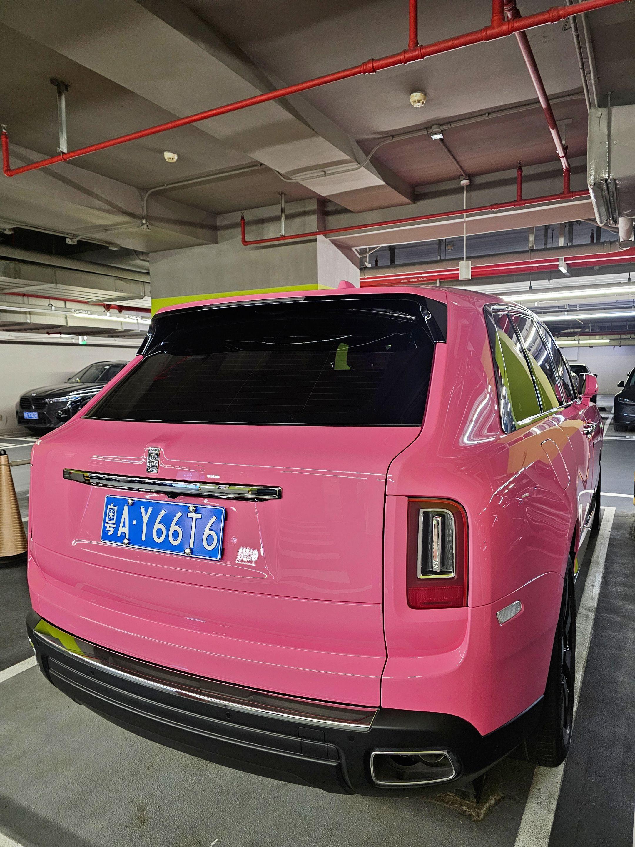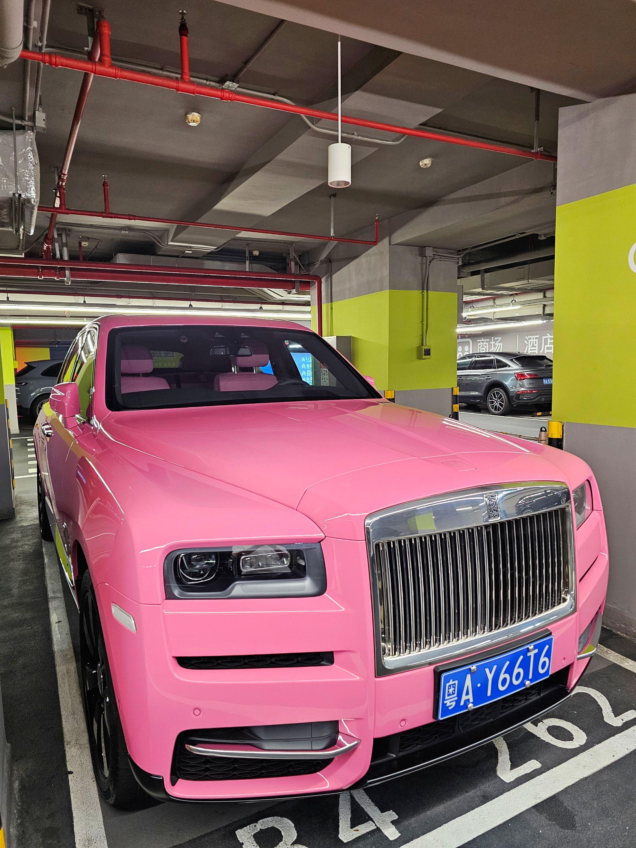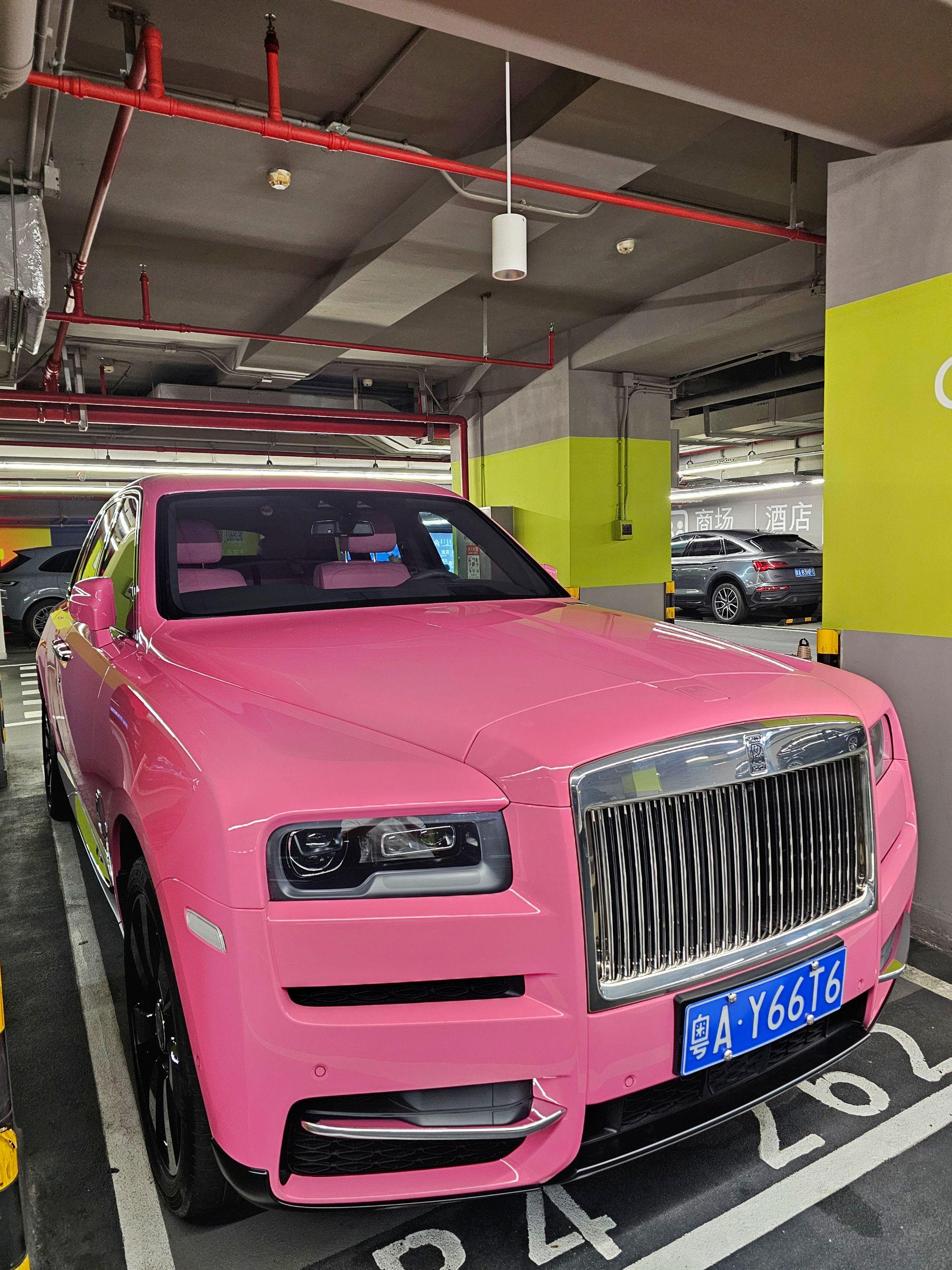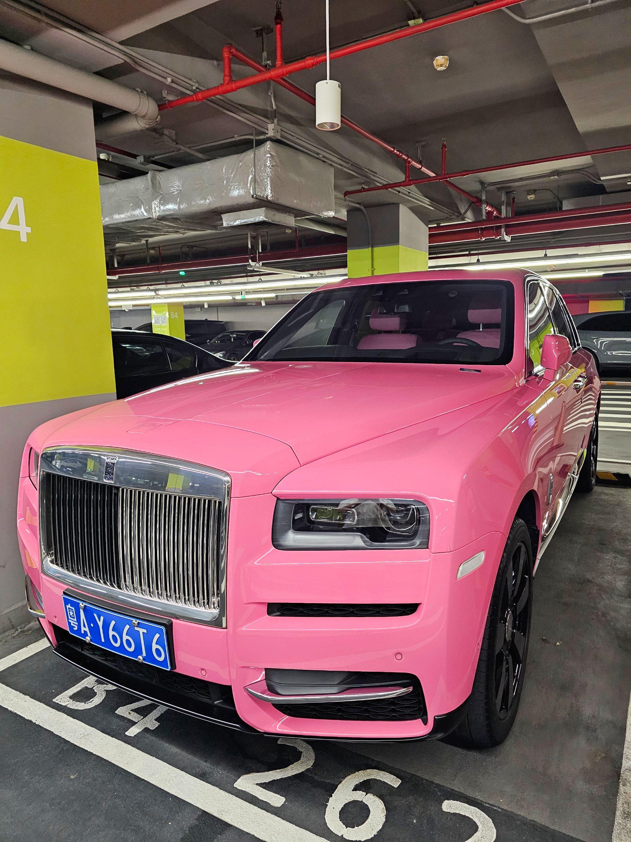 在广州某地库偶遇小姐姐的粉色劳斯莱斯库里南,粉色外观粉色的内饰座椅,这...