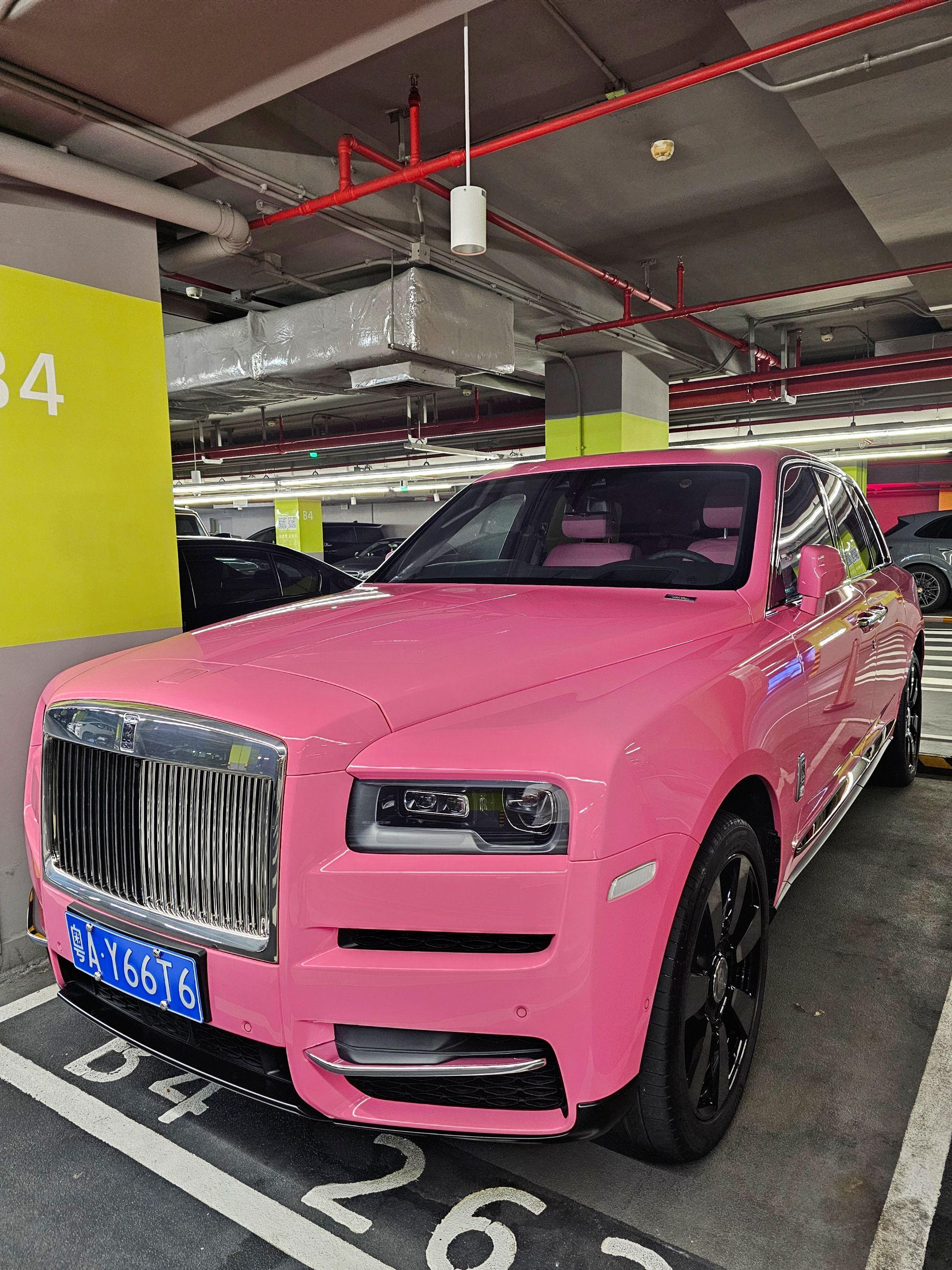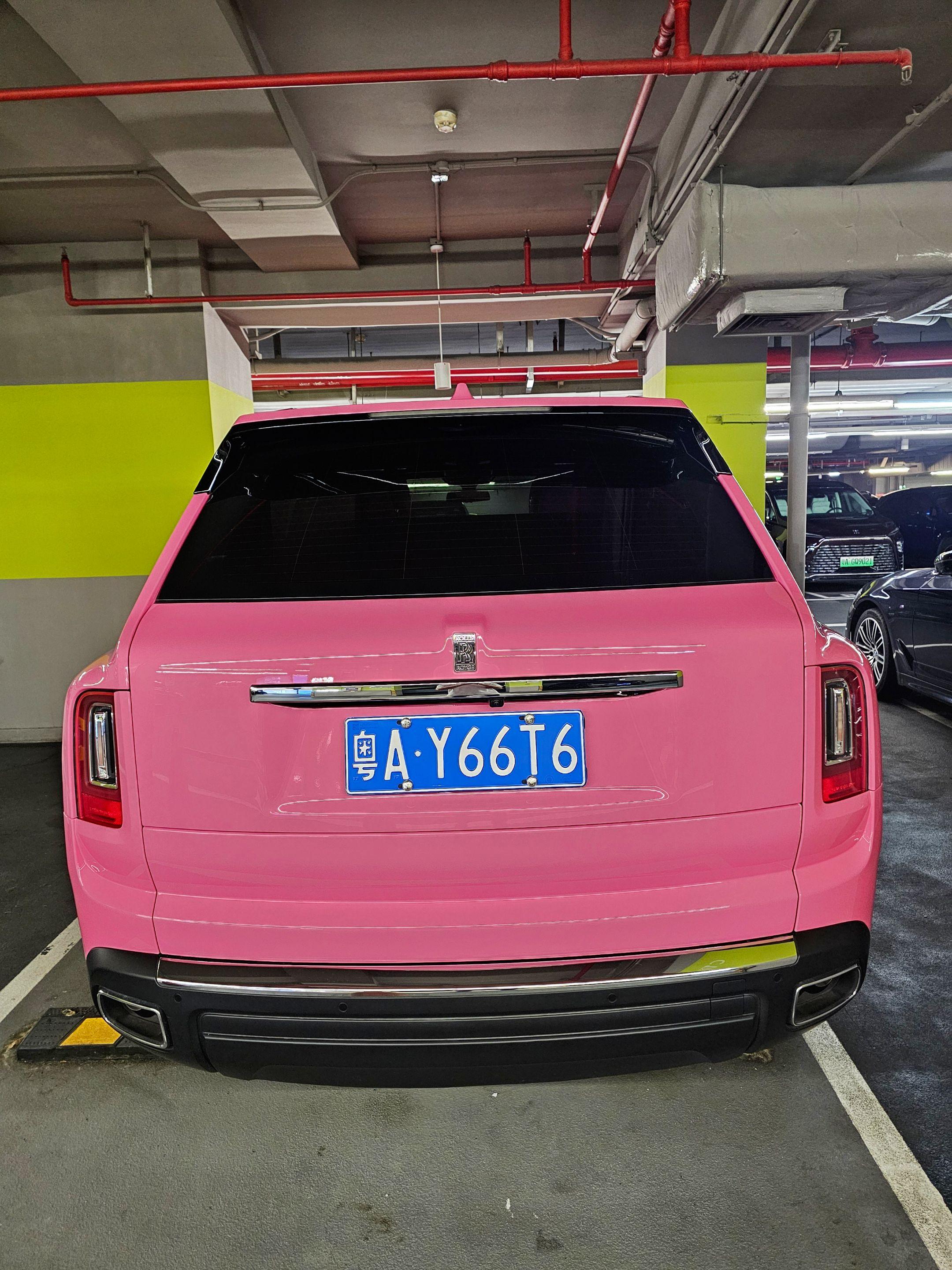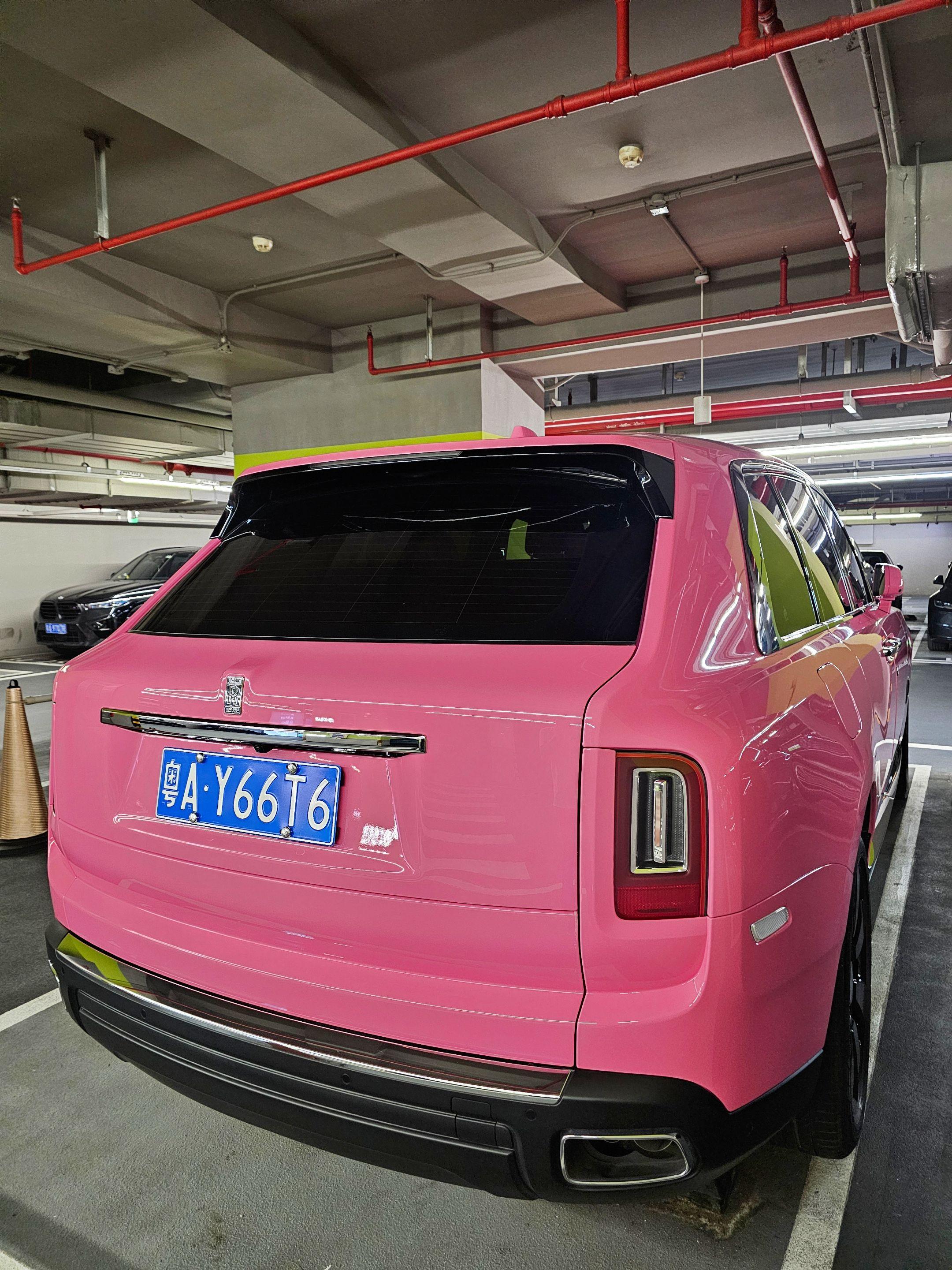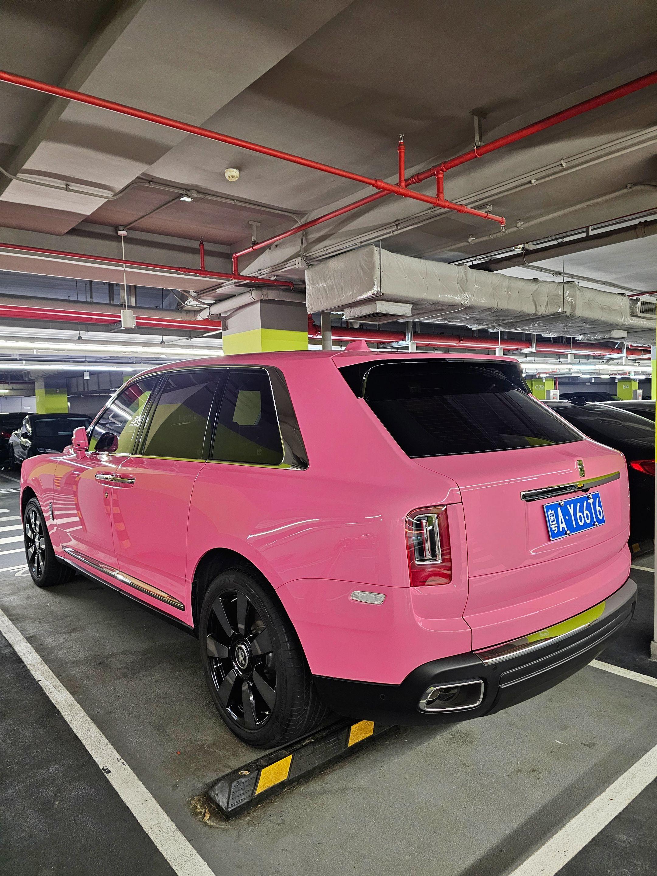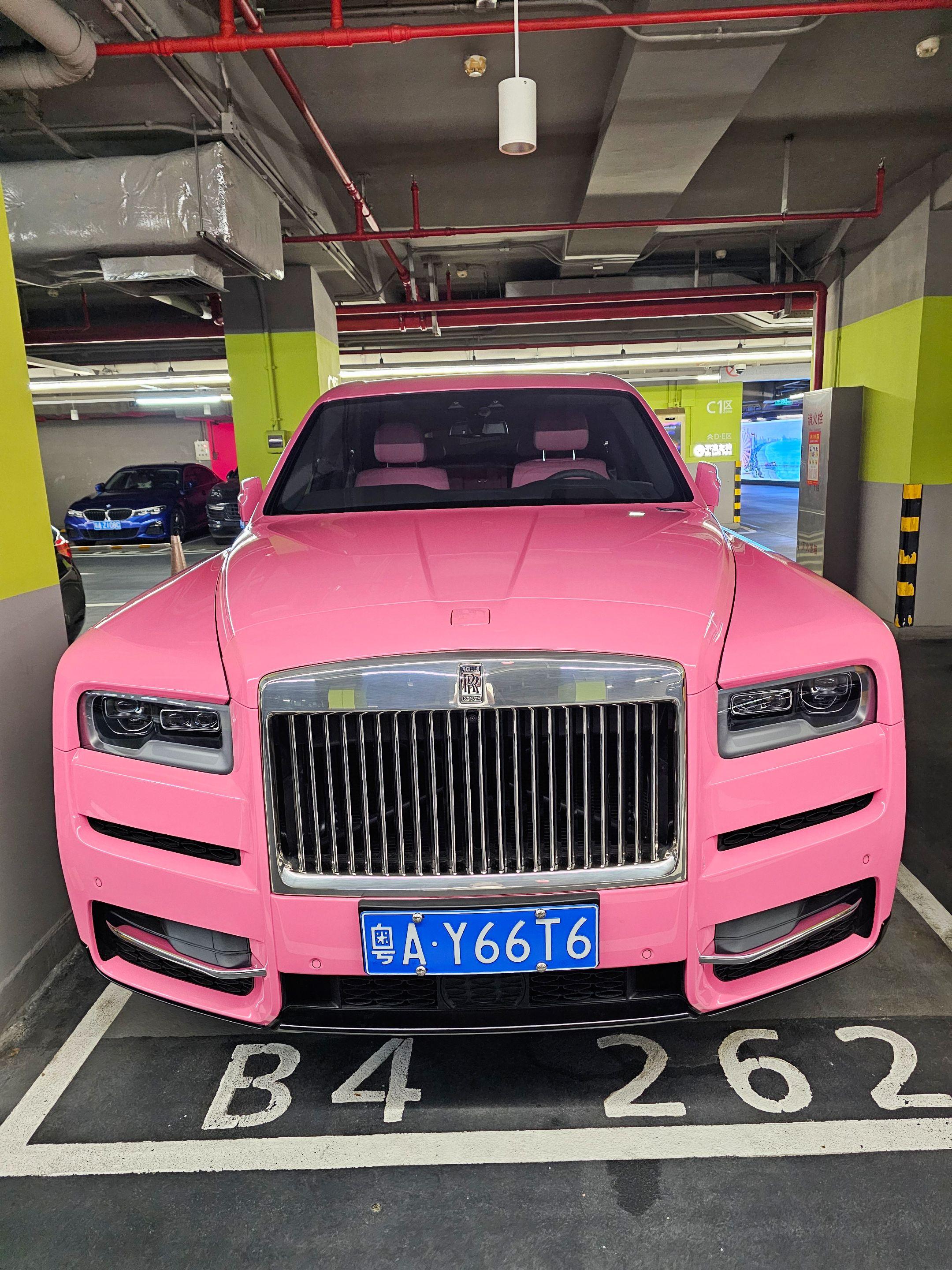 在广州某地库偶遇小姐姐的粉色劳斯莱斯库里南,粉色外观粉色的内饰座椅,这...