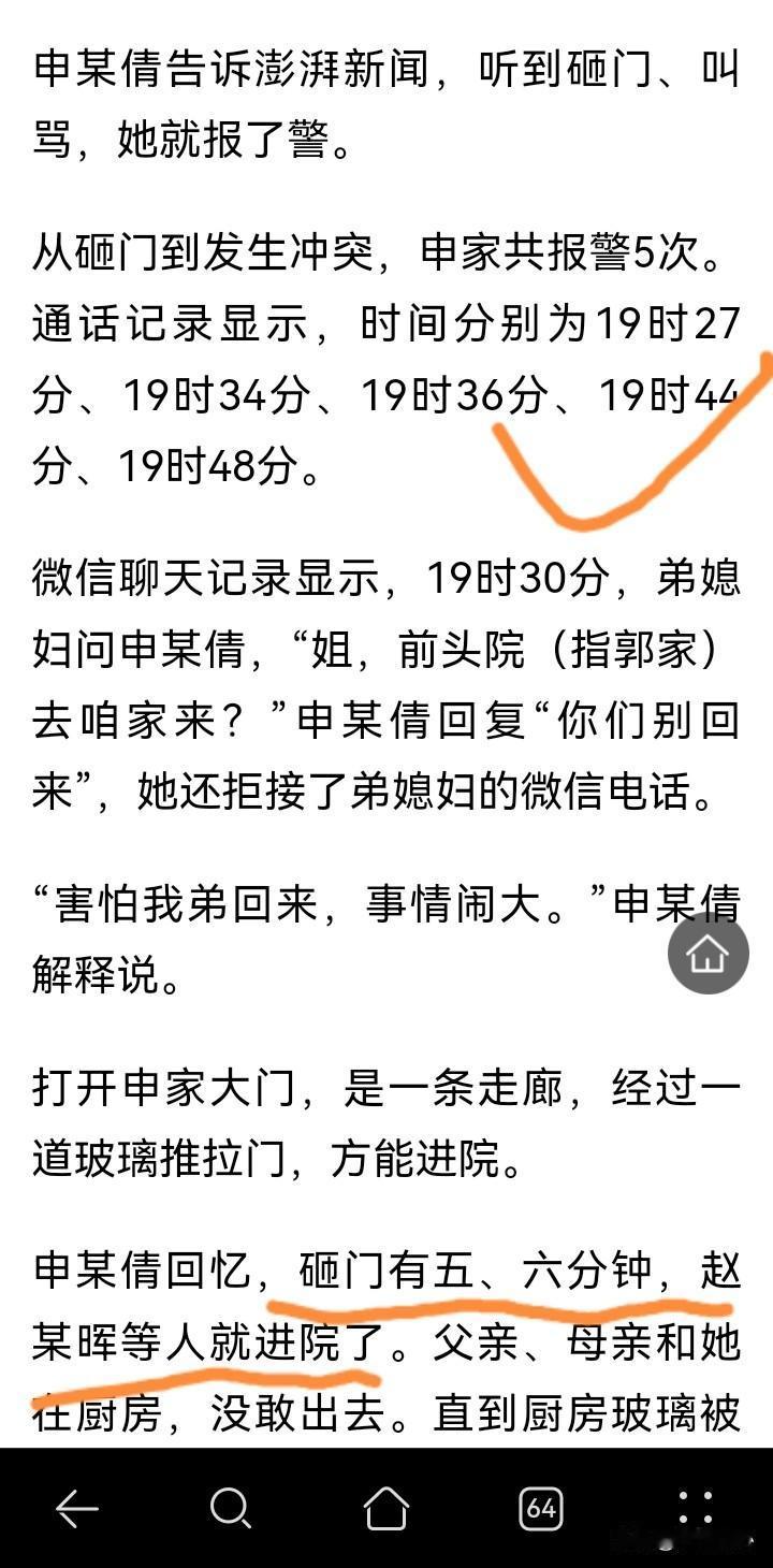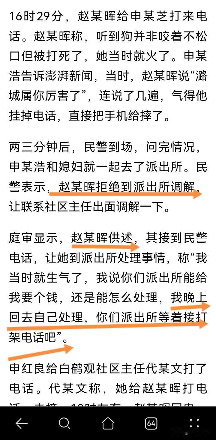 要求5分钟到达现场的出警时间,怎么到了山西长治,“一条狗引发的血案”,民警起码二十多分钟都没有到场呢?! 根据澎湃的报道,从砸门到发生冲突,申家共报警5次,时间是19:27,19:34,19:36,19:44,19:48,时间跨度有21分钟了,说明20多分钟,警方都还到达不了现场。 民警的具体到达时间暂时我们还不知道啊。 而且,申家的女儿申某倩回忆,对方砸门有5、6分钟,然后就进来自己的院子了。 起初,我以为这是长治哪个偏远的县城的偏远乡镇农村吗,到我发现这是长治潞城区的潞华街道白鹤观社区,明显是城区内啊,那就更不简单了。 依照现行的派出所出警要求,城区是要求5分钟到达的,此次事件中,警方花了起码20多分钟都还到不了。 要说当地派出所不知道事情的严重性,通过相关报道我们也知道,民警表示,郭某晖拒绝调解。更绝的是,庭审显示,这个郭某晖表示自己当时还和民警说了“我晚上回去自己处理,你们派出所等着接打架电话吧”! 如今发生了全国人民都关注的血案和审判,是否当地警方也应该说说,出警这么慢,究竟发生了什么事情呢?