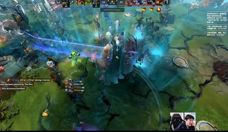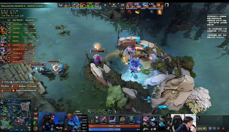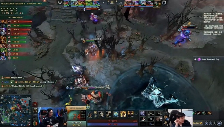 [8分钟]好不容易下高台到中路补线的xNova干扰者又被Nisha大鱼人带队过来包夹击杀,干扰者经济垫底。