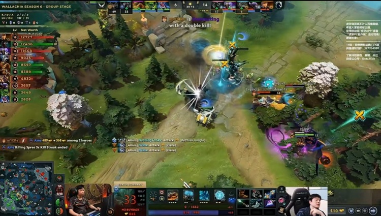 [17分钟]xxs钢背兽被mICKe玛西BKB过来打脸击杀,NTS撼地者跳过来交大反打将Boxi祸乱击杀,但自己技能被tOfu沉默大断掉,玛西跳过来留下撼地者。Liquid杀人控下肉山,Nisha大鱼人带盾。