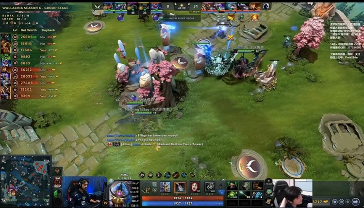 [34分钟]Ame恐怖利刃下高地被捉,外面没有视野,XG经济落后22K,被封在高地上。Liquid把握机会再破中路高地。