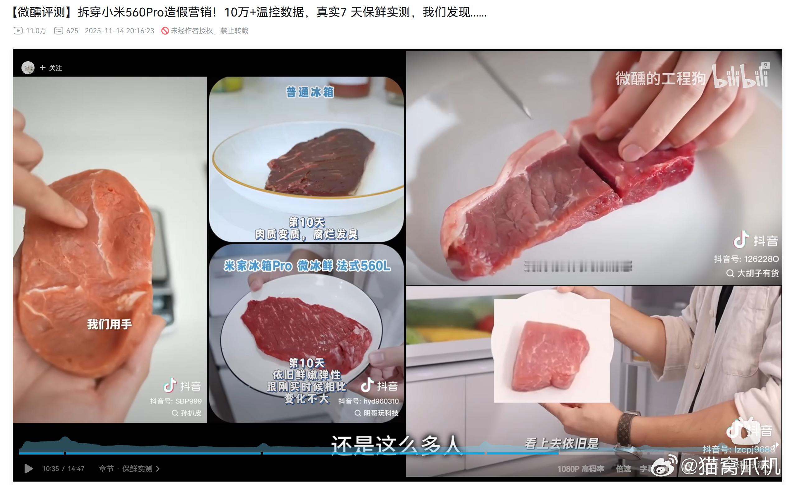 b站博主微醺测试了小米目前的旗舰冰箱560pro,只能说这款售价6399的冰箱确实挺让人失望的。这款冰箱的温区设计存在很大问题,没有专门的蔬菜冰温区,也没有肉类的微冻区,这一点甚至比不上几年前出的小米冰箱550。然而产品宣传页面却宣传这款冰箱的肉类冰温区可以保鲜十天,蔬菜也能保鲜七天以上。经过博主测试,小米冰箱560pro的肉类在第七天已经变质,如果不套保鲜膜则是水分流失超过20%,都是完全没法吃的状态,而蔬菜也在第七天失去了10%的水分。除此之外,这台冰箱的做工以及空间设计也处处都是槽点,作为这么贵的一台冰箱实在有失水准。