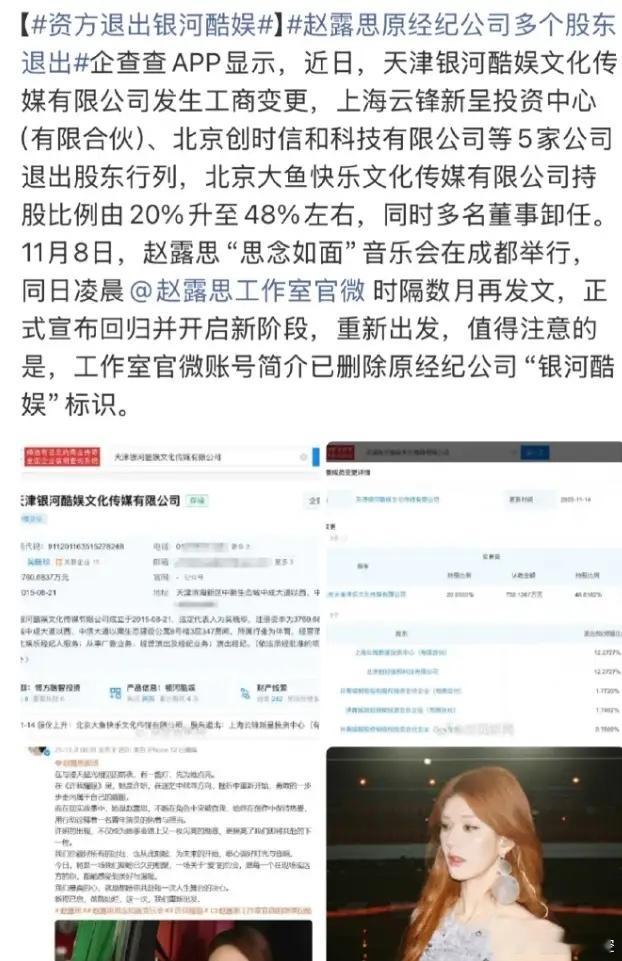 赵露思和银河酷娱一拍两散两败俱伤!解约风波后,赵露思工作停滞近一年,经纪公司这边也好几个股东退出了,但是不管结局如何,只要赵露思这边接受了其他资本的帮助,那也就面临着继续被控制的命运,想要真正的自由,很难。