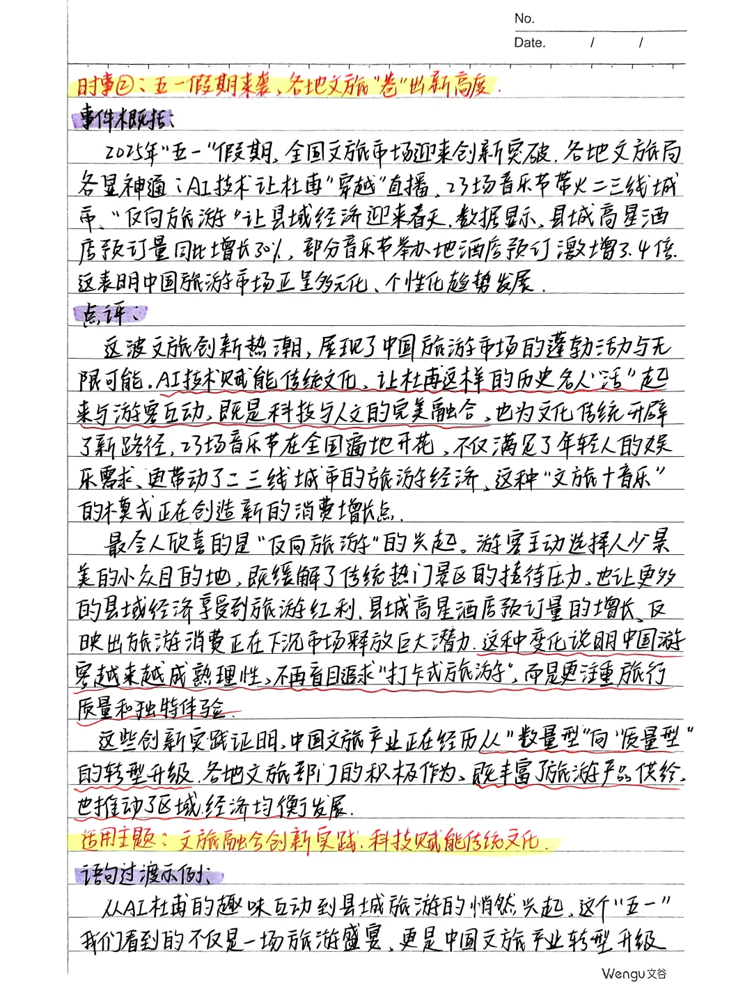📕热乎乎的五一时事篇素材来啦\n✅时事①:致敬,边防战士手脚并用守护祖国边防线\n从都市的霓虹到雪山的苍茫,两种截然不同的青春在同一个时代交相辉映,当我们在温暖的房间刷到这段视频时,屏幕那端的战士正用冻僵的手指紧握钢枪,为我们的岁月静好负重前行!\n✅时事②:五一假期来袭,各地文旅“卷”出新高度\n从AI杜甫的趣味互动到县城旅游的悄然兴起,这个\"五一\"我们看到的不仅是一场旅游盛宴、更是中国文旅产业转型升级的生动写照。当游客开始追求更有品质、更具特色的旅行体验时,整个行业也在顺应需求不断创新求变。\n
