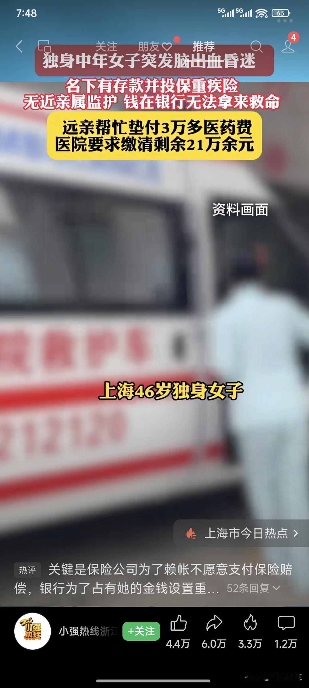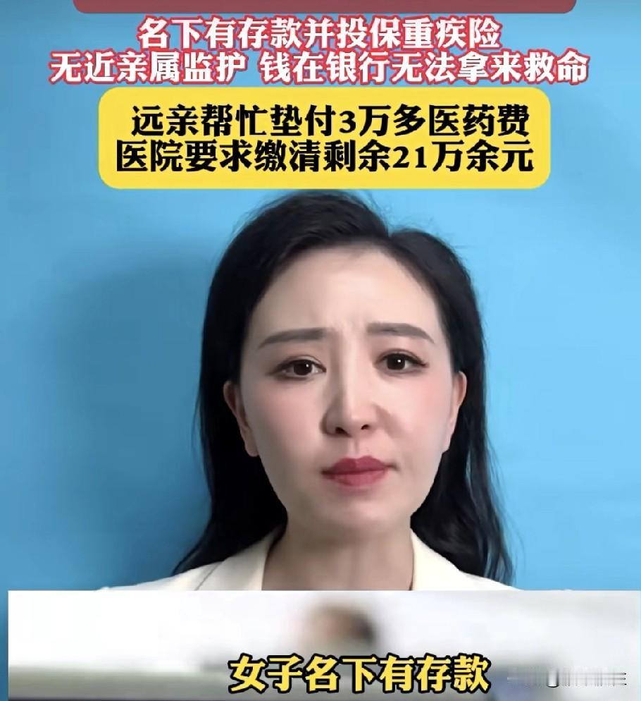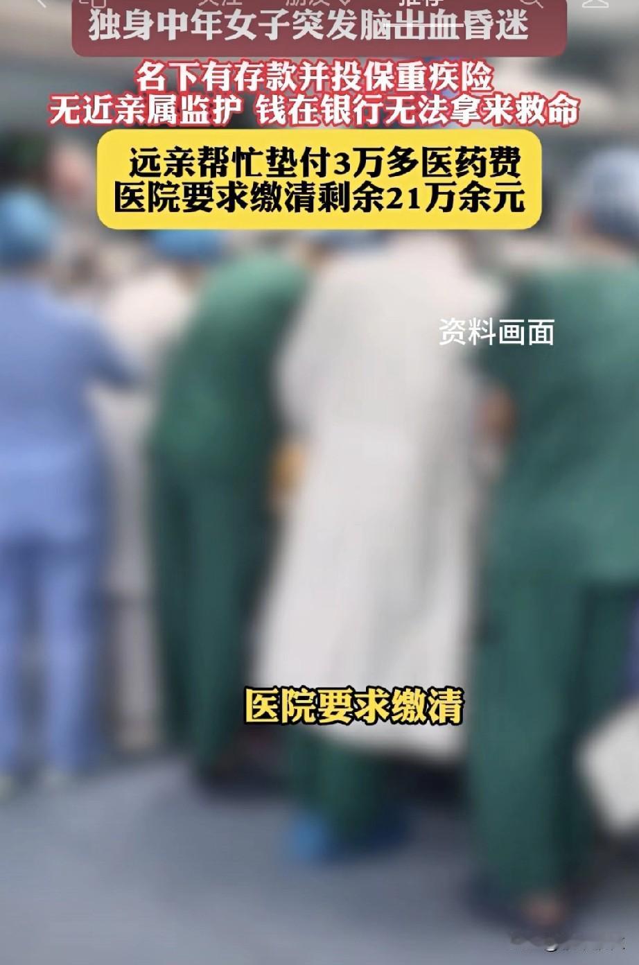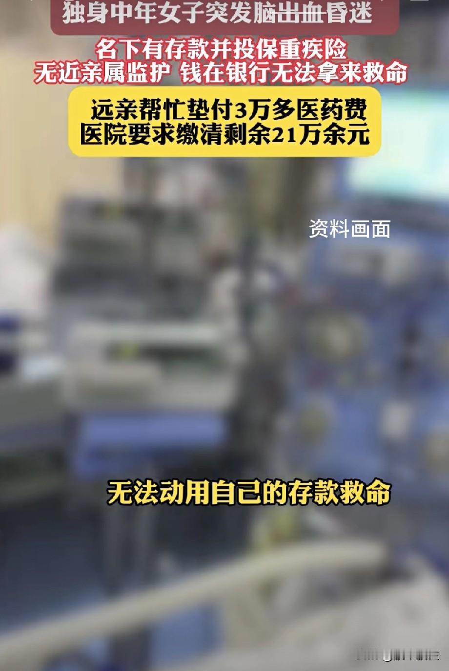 扎心呢? 上海,近日。 46岁独居女子,有存款,重疾险,无子女,无双亲,无监护,突发疾病,存款和重疾险都成了摆设等同于没有啊! 看看事情经过是怎么样的? 独身中年女子突发脑出血昏迷 ,名下有存款并投保重疾险,无近亲属监护,钱在银行无法拿来救命,远亲帮忙垫付3万多医药费,医院要求缴清剩余21万余元。 事情的经过并不复杂,但作为孤家寡人的女子昏迷后,他的存款和重疾险也救不了他的命。人好好的什么都有,不行的时候,有了等于没有。