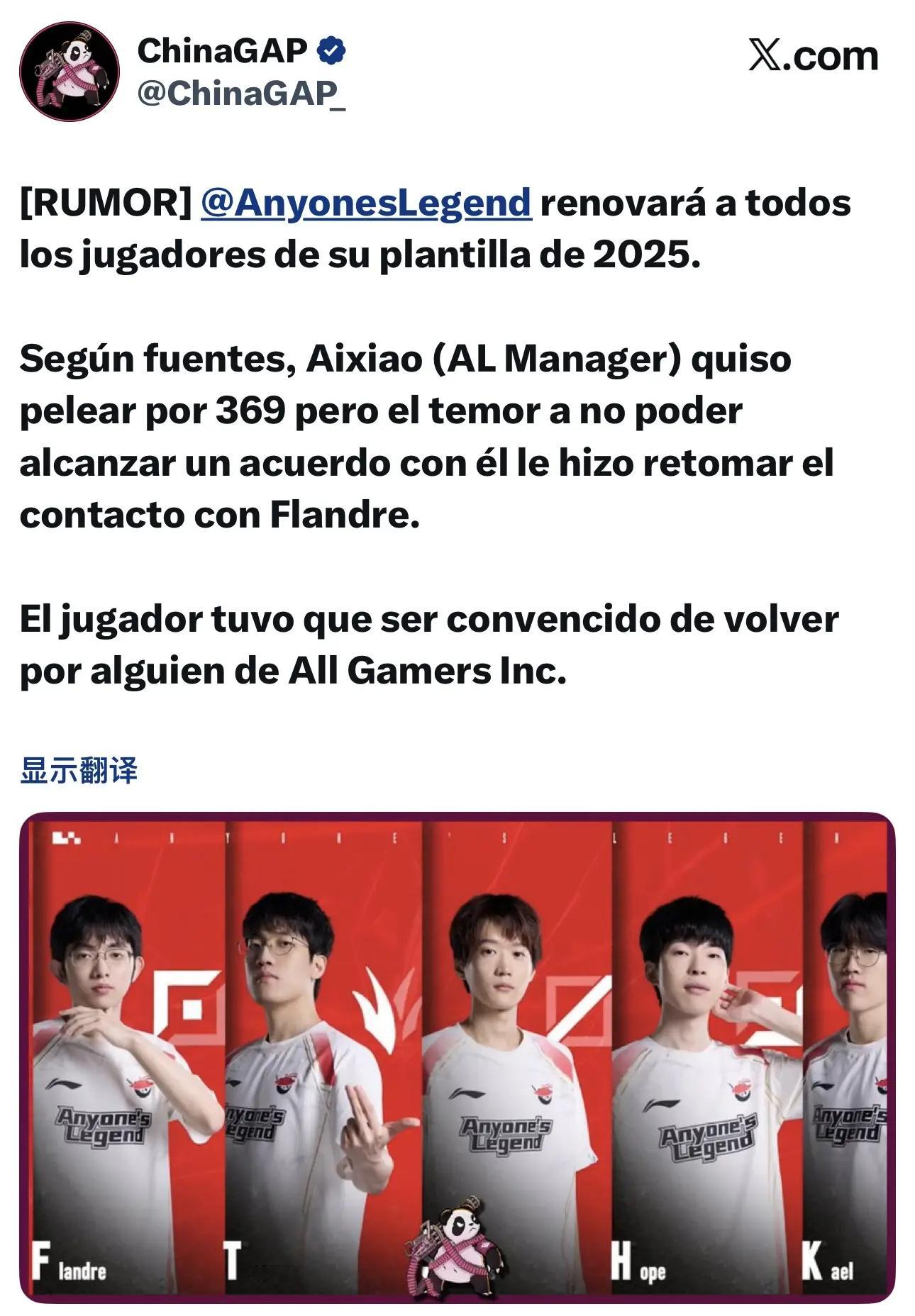 AL全员续约!本有意牵手369但担心无法达成协议AL战队将与其2025年阵容的所有选手续约。消息据内部人士透露,AL经理爱笑曾有意争取选手369,但因担心无法与其达成协议,重新与Flandre取得了联系。据悉,Flandre是由傲竞集团内部人士说服重返赛场的。