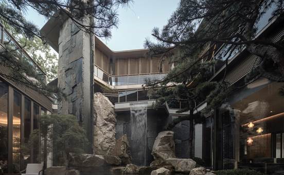 景观设计上,“江南三章”打破平面局限,打造立体互动的自然空间。运河樾打造杭州首个“立体峡谷园林”,12米高差水景贯穿三层园林,实现“引水入园、枕水而居”;如玺华院以杭州“郭庄”为蓝本,15米高差叠石飞瀑与亭台楼阁、檐下游廊、小桥流水相互映衬;观锦宸樾府则规划“观锦九境”,下沉庭院瀑布与茶亭形成“飞瀑揽月”,采用了三境理水系统,兼顾生态循环与观赏体验。
