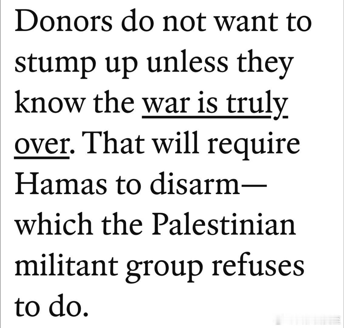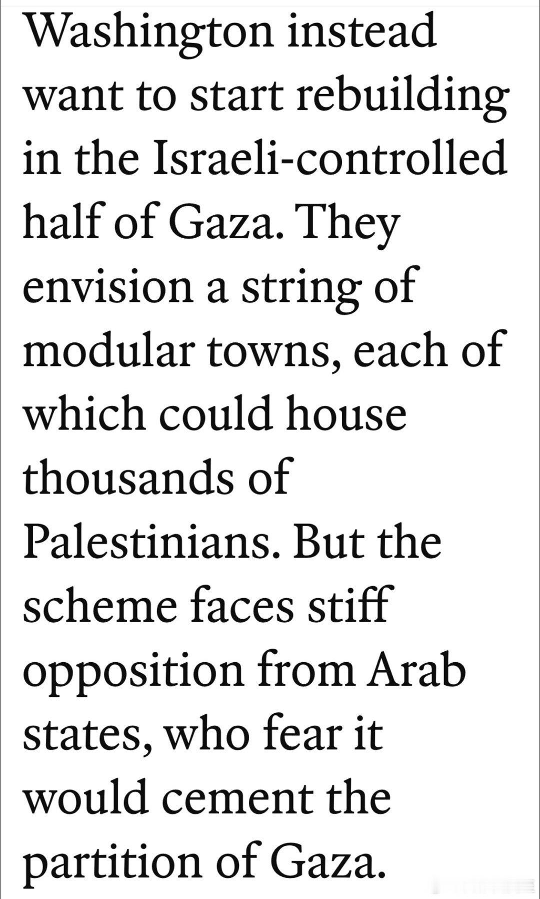 加沙现状:停火已一个多月,重建还没有开始美以希望在以军控制的地区建临时住房,阿拉伯国家坚决不同意,担心加沙地带被永久性分区管制同时,阿拉伯国家也不愿捐款,因为需要确定战争真的结束了,而哈马斯至今没有同意放下武器
