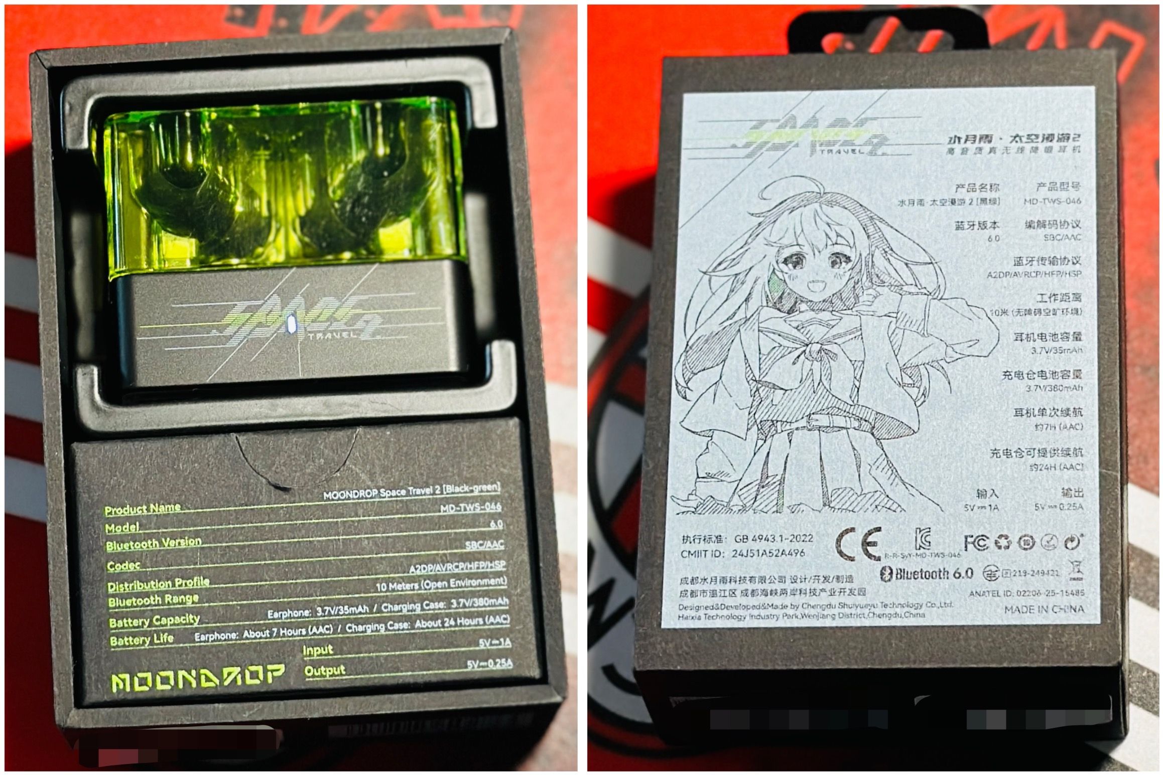 外包装依旧是水月雨标志性的“太空快递”风格——绿白撞色像星舰补给箱,背面看板娘的二次元立绘。当时我还没拆开,理工男同事就直呼“二次元老婆”,看来是很对他的味。