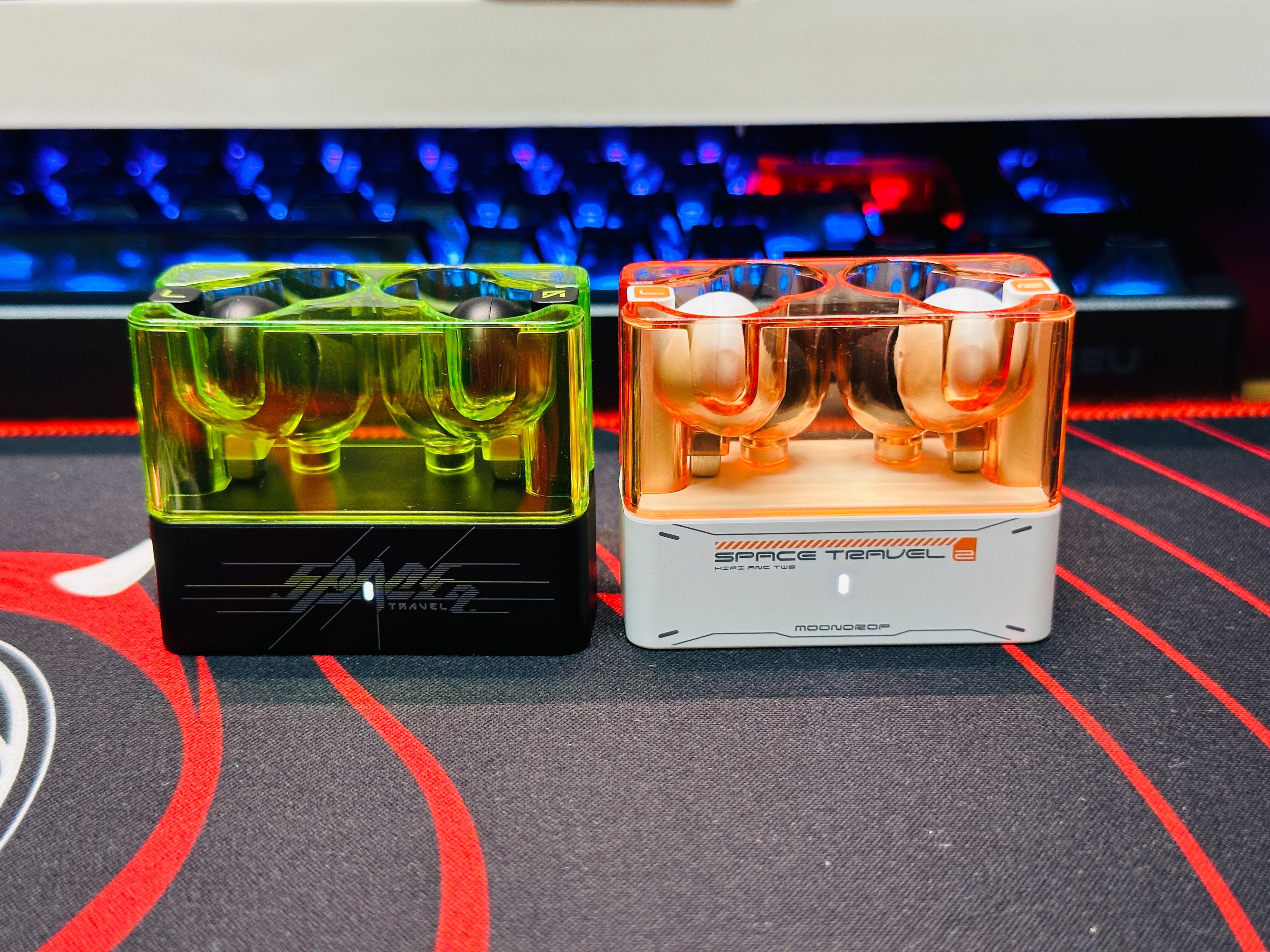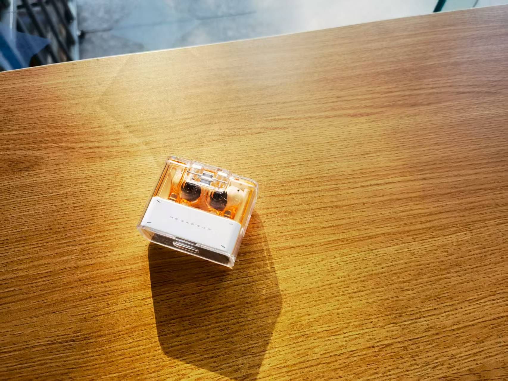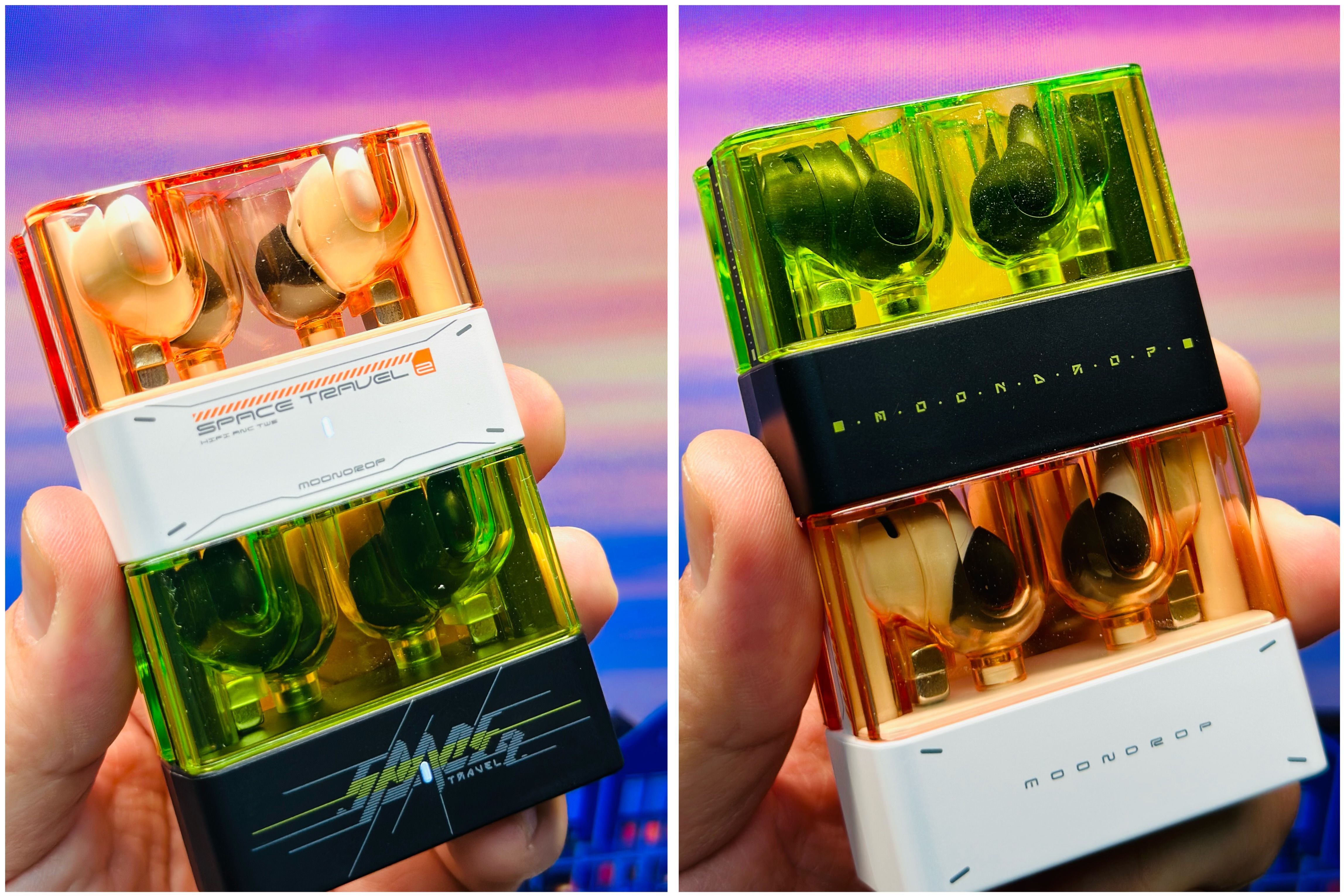 我脑子里最先浮现的,是便利店冰柜里那瓶还带着雾气的苏打水:外壳透明,气泡翻腾,一口下去,凉意顺着喉咙直通耳膜。拆开快递盒,水月雨「太空漫游2」就给了我这种错觉——充电仓的薄荷绿像把莫吉托冻成了冰块,取出耳机时则像两颗刚从冰格里落下的方糖,带着一点“咔哒”的脆响,落进掌心。