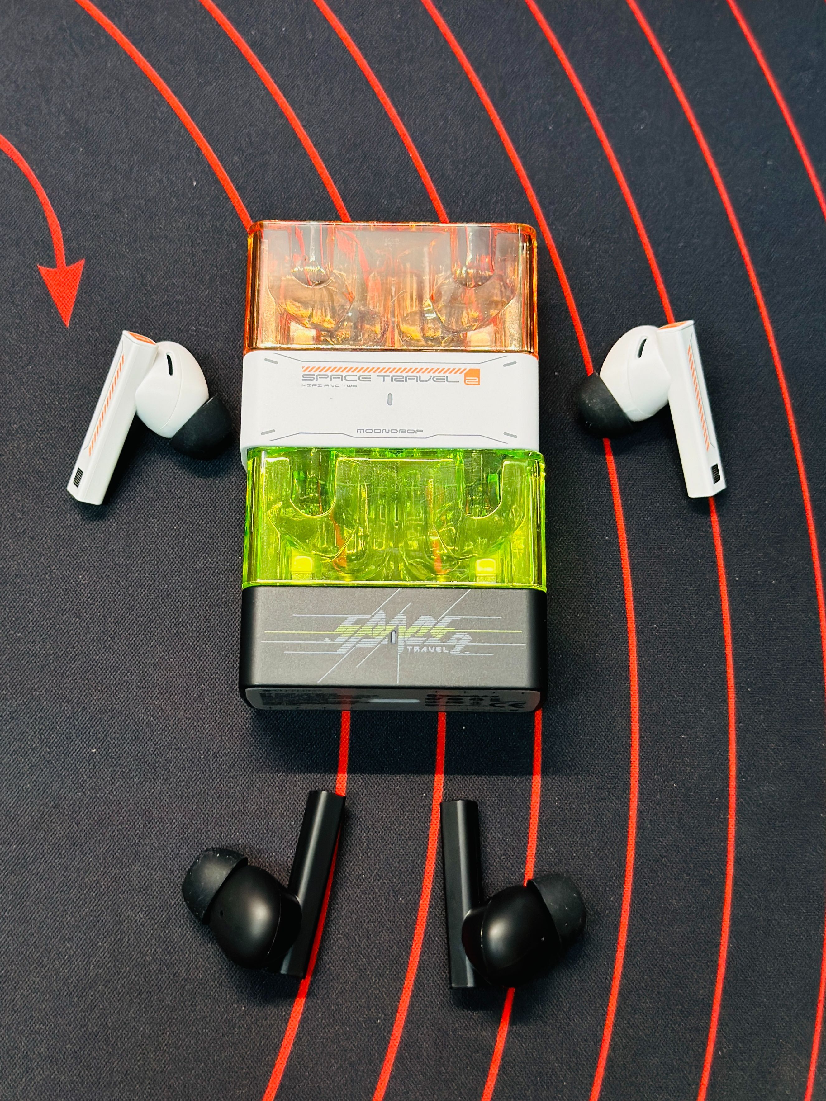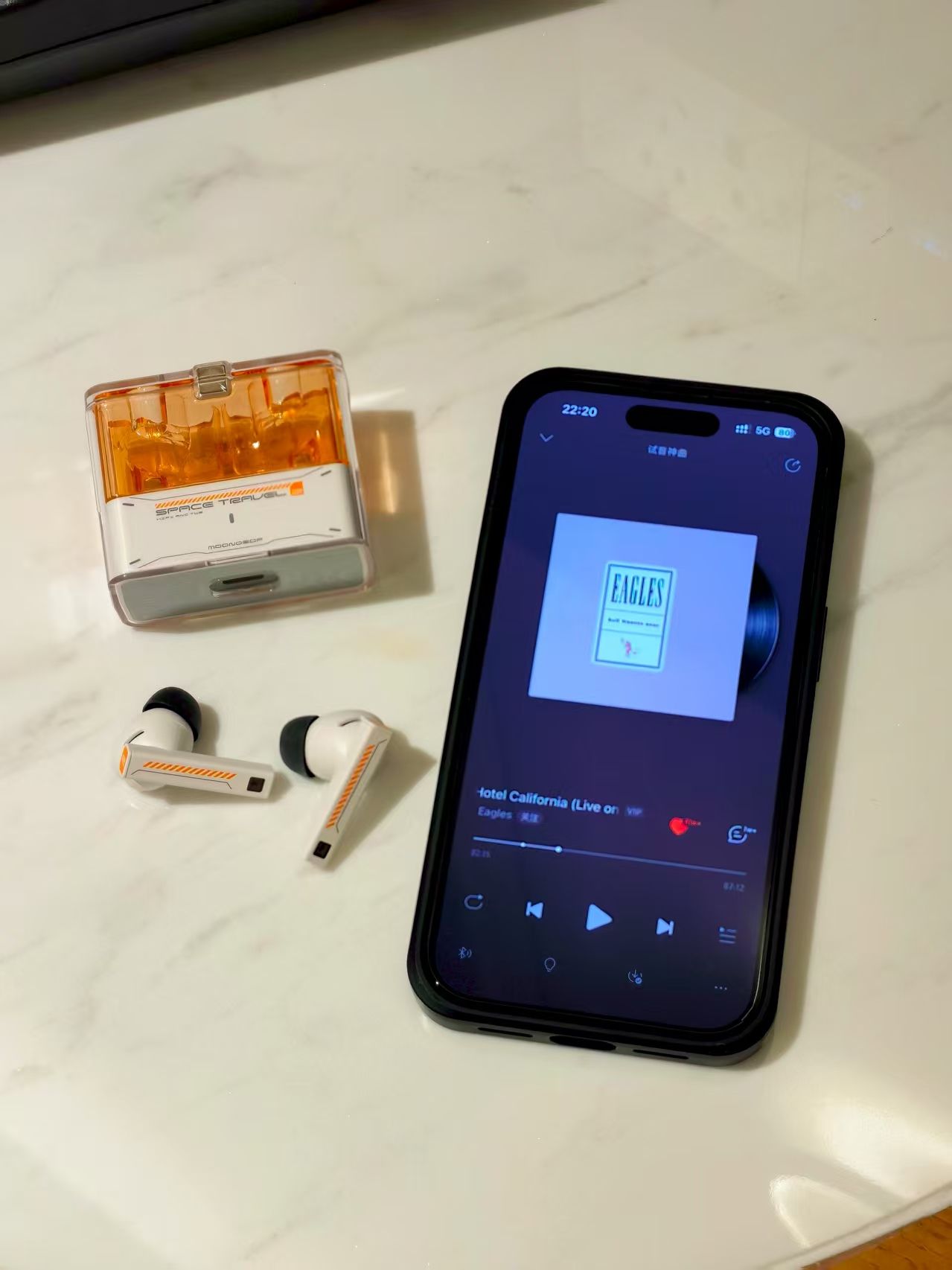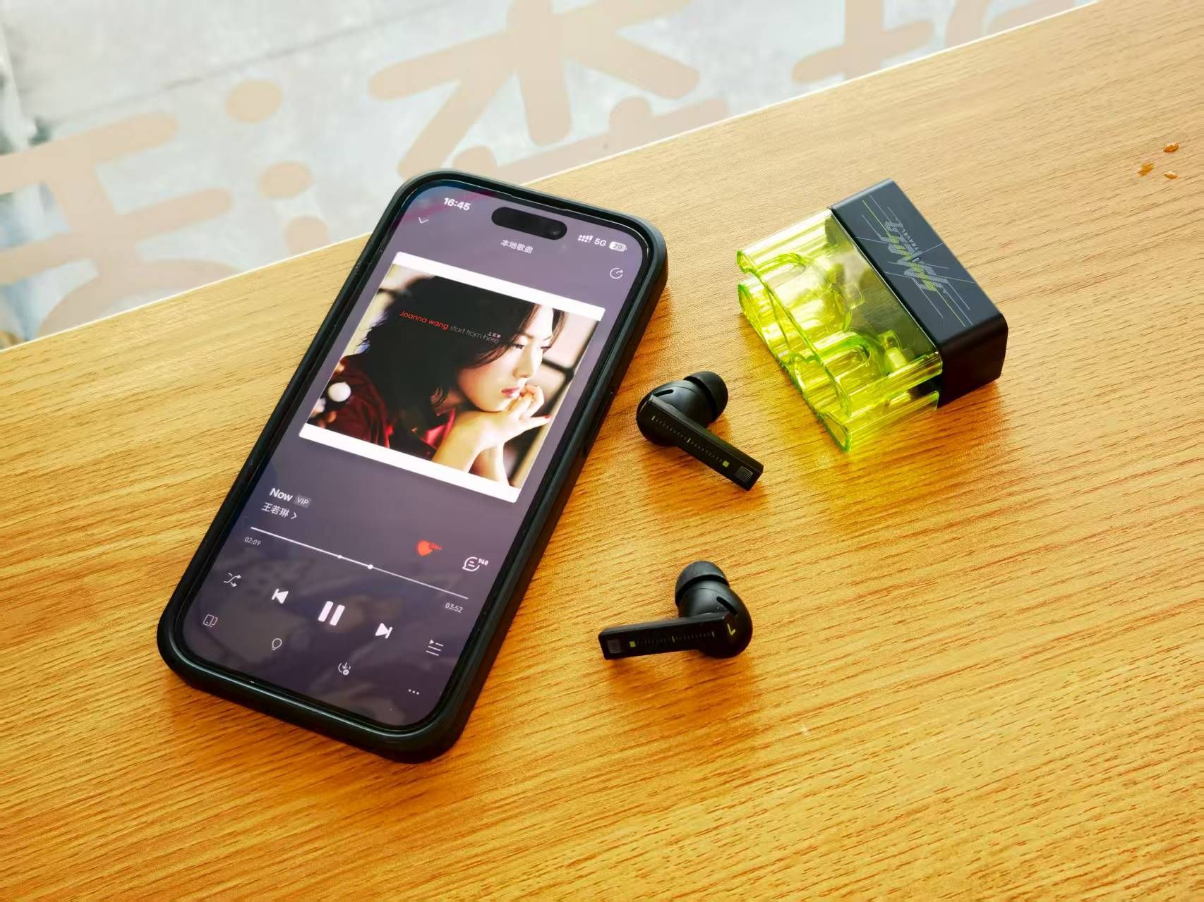 充电仓是这次最戳我的设计。黑绿透明壳像《流浪地球》里的休眠舱,耳机竖插在两侧,像两枚待命的发射火箭。磁吸力度适中,倒扣不会掉,但一开单手滑出时有点“卡住”——可能是新机的阻尼感,熟练以后就会好得多。