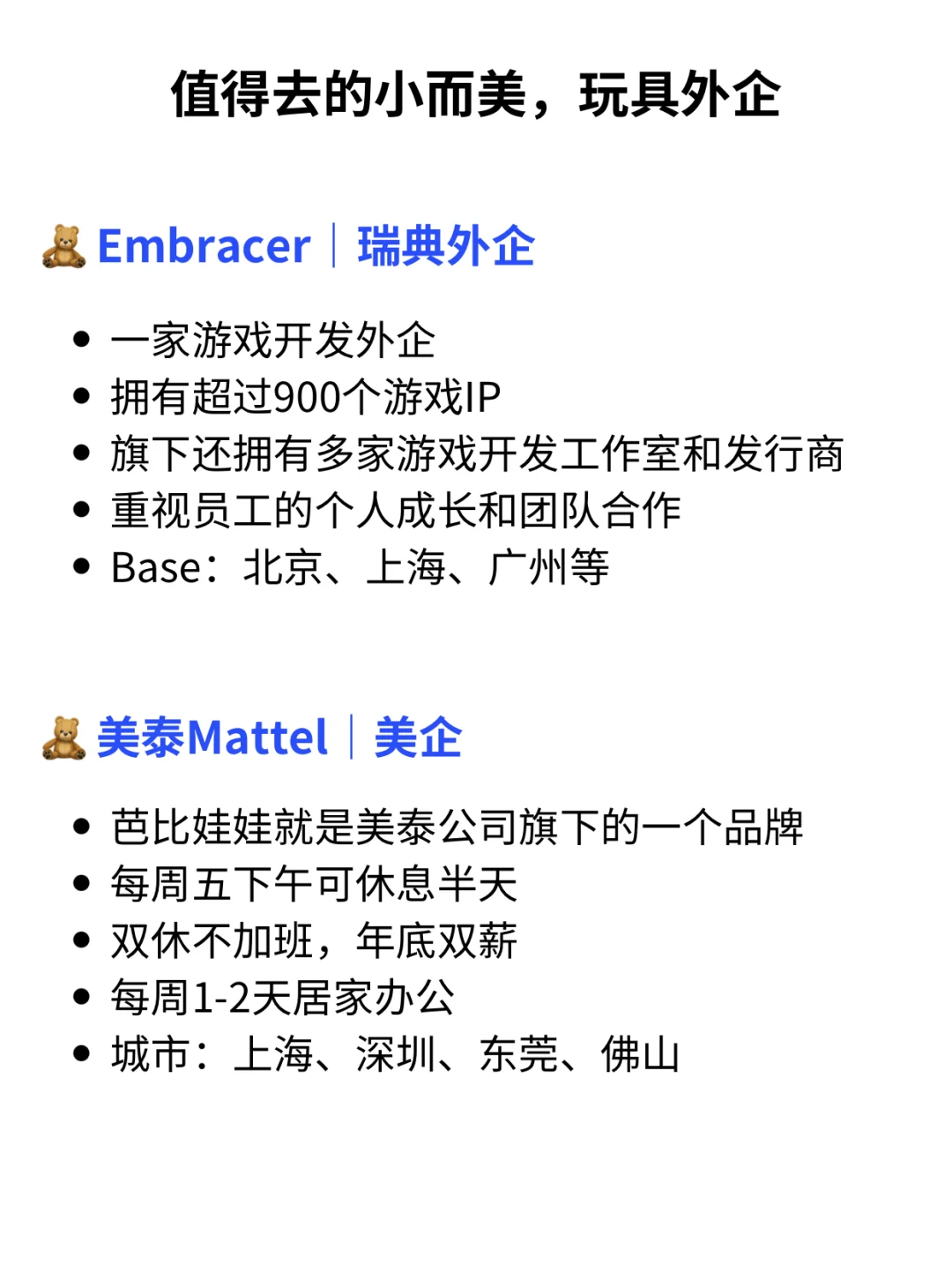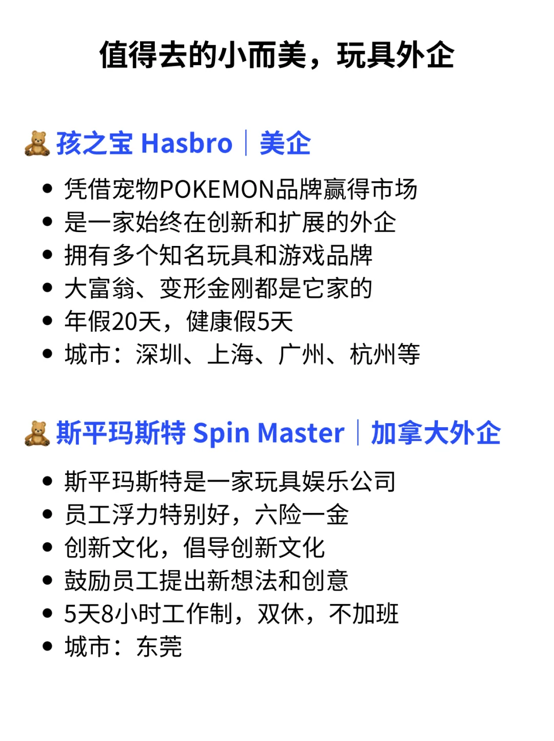 真心劝有能力的小伙伴们,大胆求职外企,作为外企人,经常有小伙伴问我:“外企是不是天天喝咖啡、不加班?” · 🌟答案很实在:咖啡管够,班偶尔加,但公平感、成长感是落地的! · 年假15天起,女生友好不是简单的口号,方方面面都考虑周到 · ✅这几家口碑很好的玩具外企,大家可以试一试【外企详细介绍👀看上图‼️】 🧸 孩之宝 Hasbro|美企 - 凭借宠物POKEMON品牌赢得市场 - 是一家始终在创新和扩展的外企 - 拥有多个知名玩具和游戏品牌 · 🧸 斯平玛斯特 Spin Master|加拿大外企 - 斯平玛斯特是一家玩具娱乐公司 - 创新文化,倡导创新文化 - 鼓励员工提出新想法和创意 · 🧸 Embracer|瑞典外企 - 拥有超过900个IP - 重视员工的个人成长和团队合作 · 🧸 美泰Mattel|美企 - 芭比娃娃就是美泰公司旗下的一个品牌 - 每周五下午可休息半天 - 每周1-2天居家办公 · 如果你想求职其他行业的外企,也欢迎下方告诉我! · 👉(求职版) 外企求职干货每日更新 🙋‍♂️瑞池帮你实现Work-Life Balance 👍往期干货: ✅挪威外企过于冷门了,实际上很好进 ✅外企面试被问:你如何做Mkt市场调研? ✅一个很变态,但能轻松进外企的方法 ✅转行转岗被问原因,面试怎么回答? ✅我发现不怕任何面试的顶级思维 -