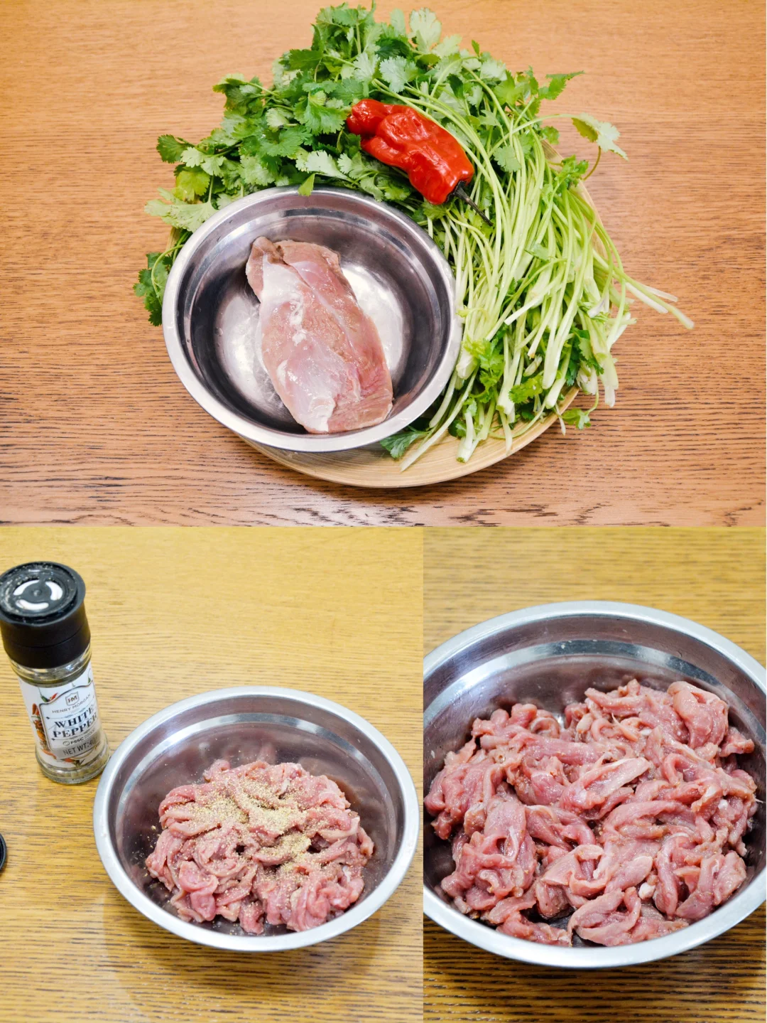 1. 鸭胸肉切细丝,研磨白胡椒粉,拌匀,腌10分钟;