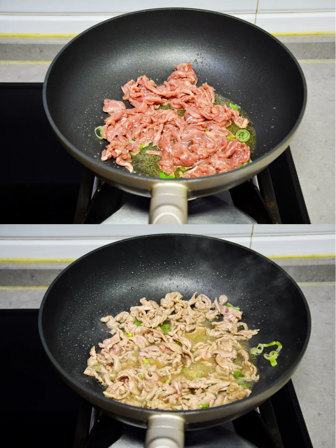 3. 温锅凉油,中火煸炒鸭肉和葱花变色;