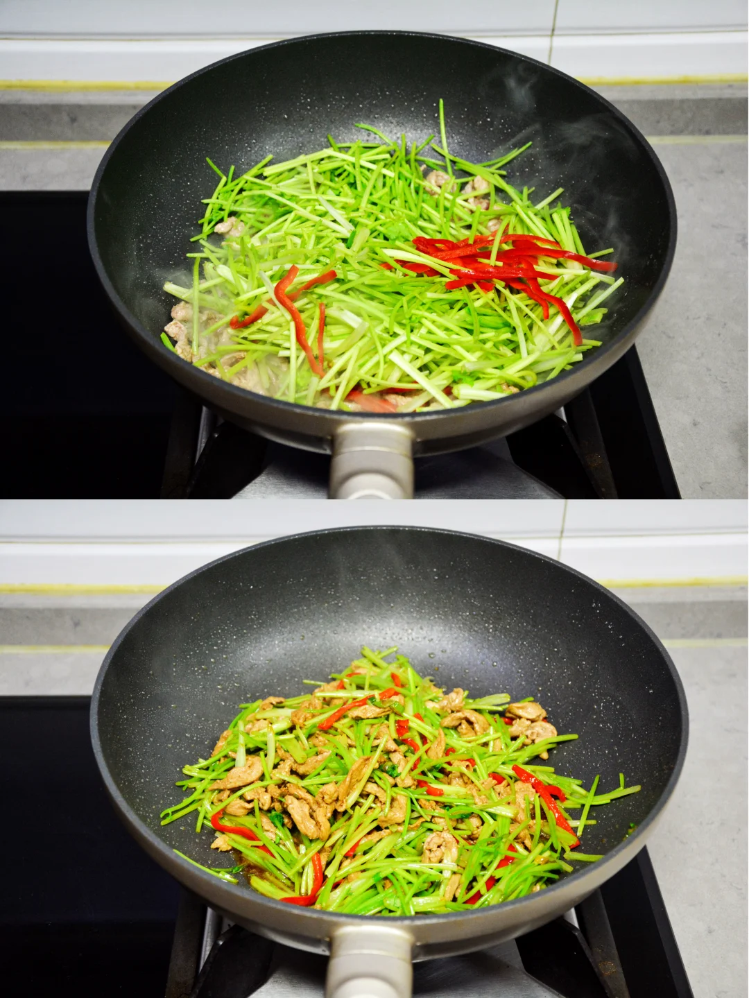 5. 撒盐、松茸鲜、倒生抽,大火翻炒均匀,蔬菜微微变软,出锅。