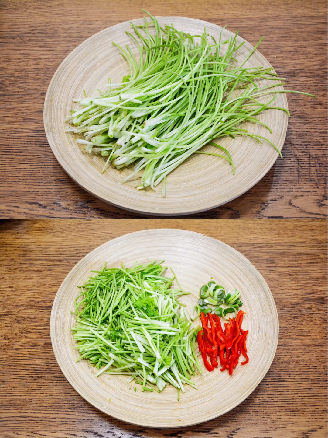 2. 去掉香菜叶,香菜杆切寸段,红辣椒去籽切丝;