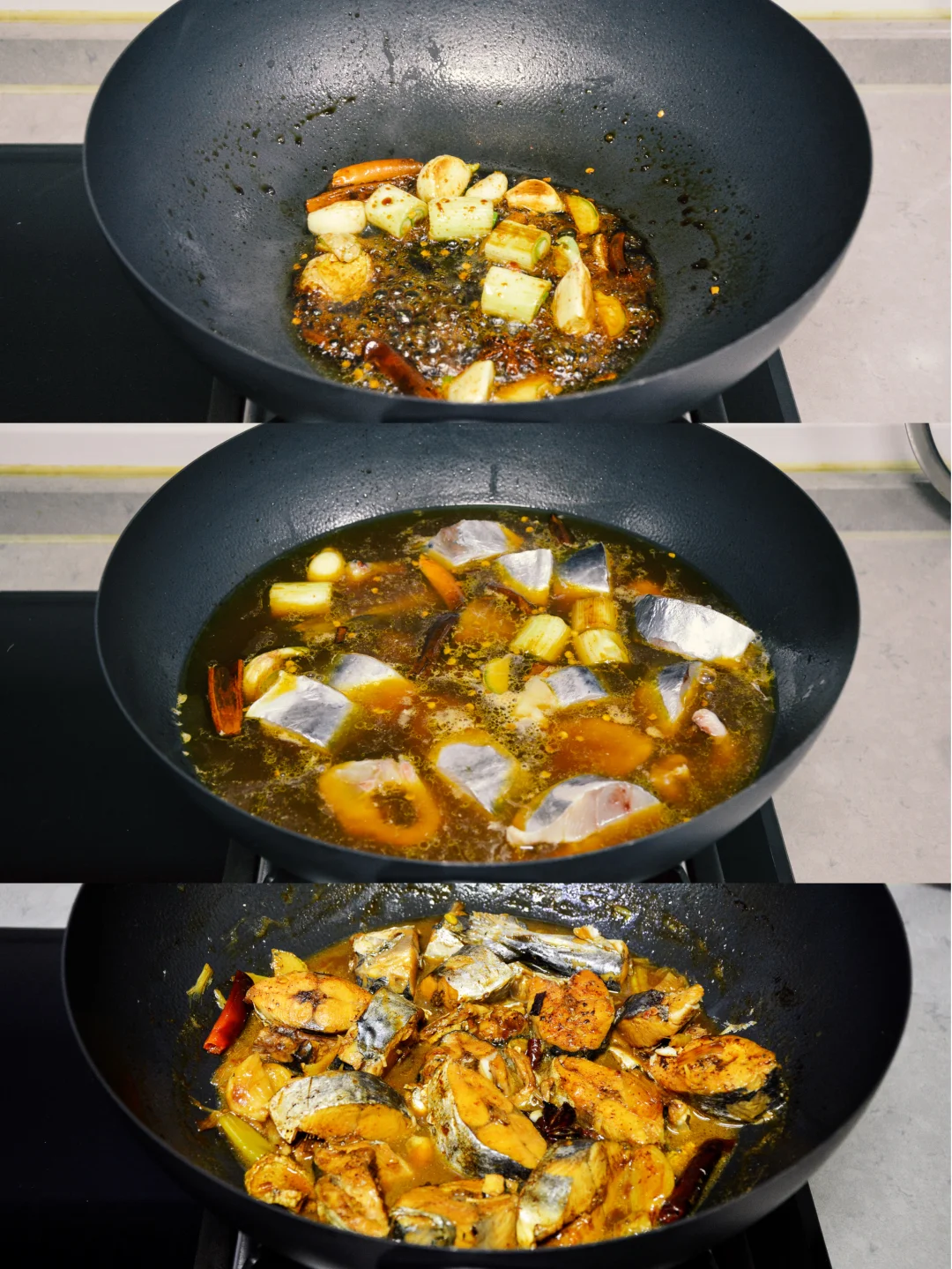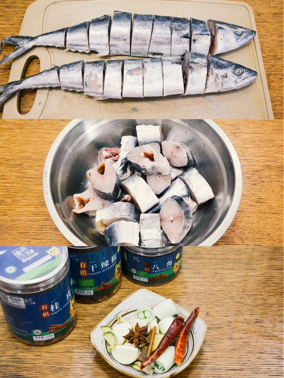 1. 未解冻的鲅鱼切块,捅去内脏,洗净,沥水;