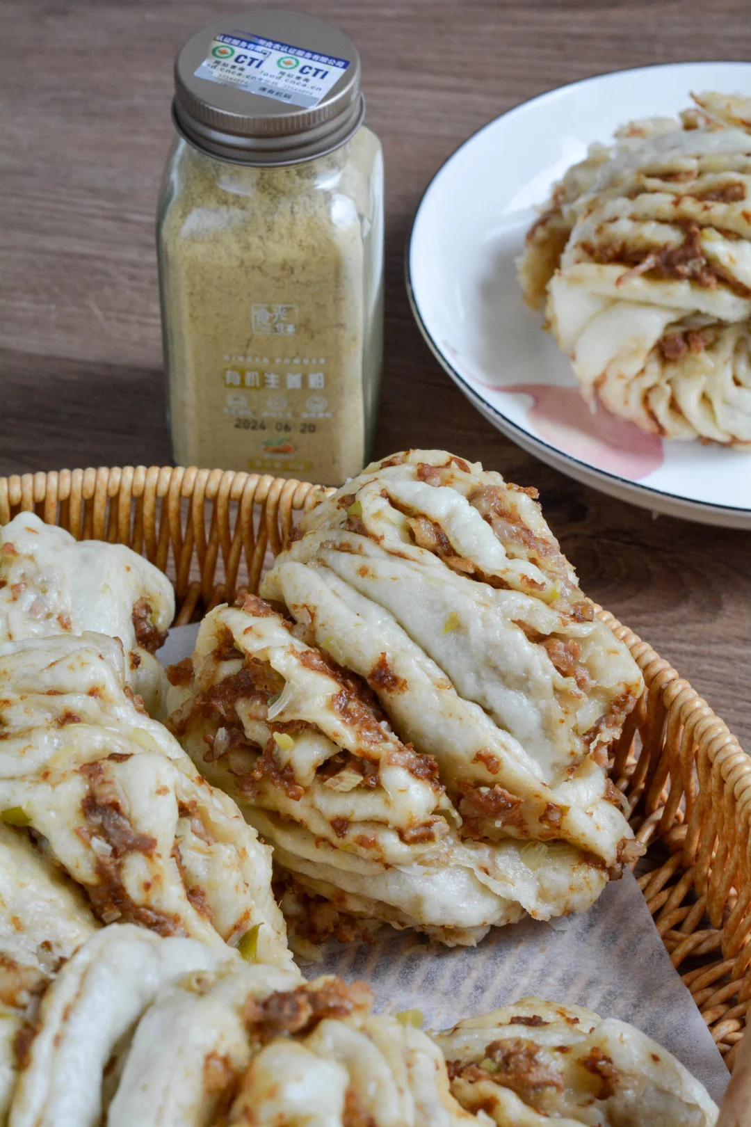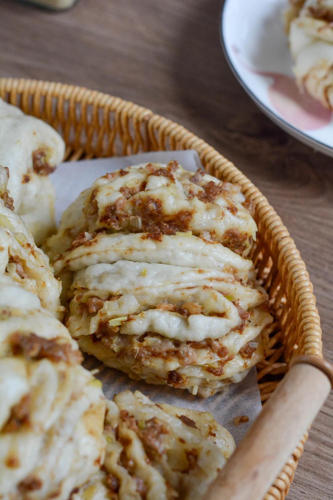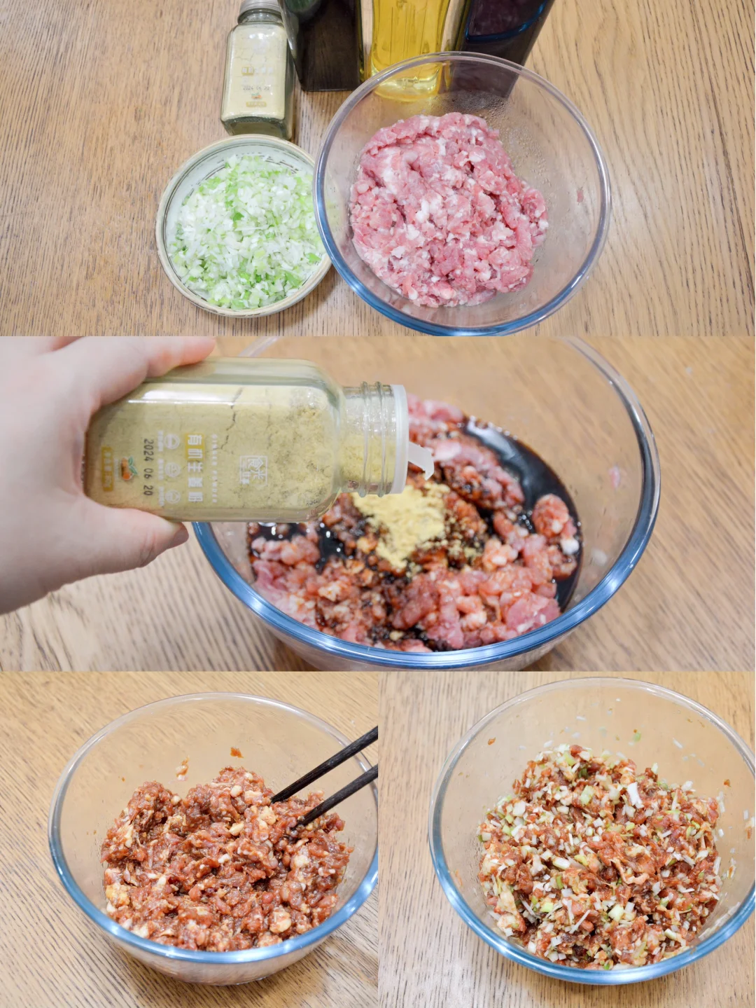 【馅料】 猪肉馅400克,大葱80克,盐2-4克,酱油30克,老抽20克,食光往事生姜粉5克,植物油10克