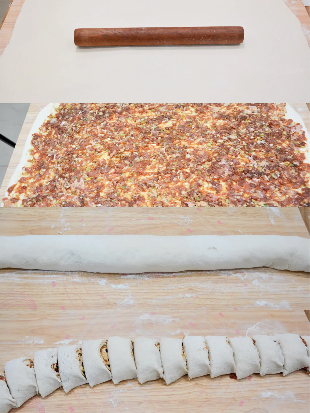 4. 卷卷,切成偶数剂子,2个摞起来;
