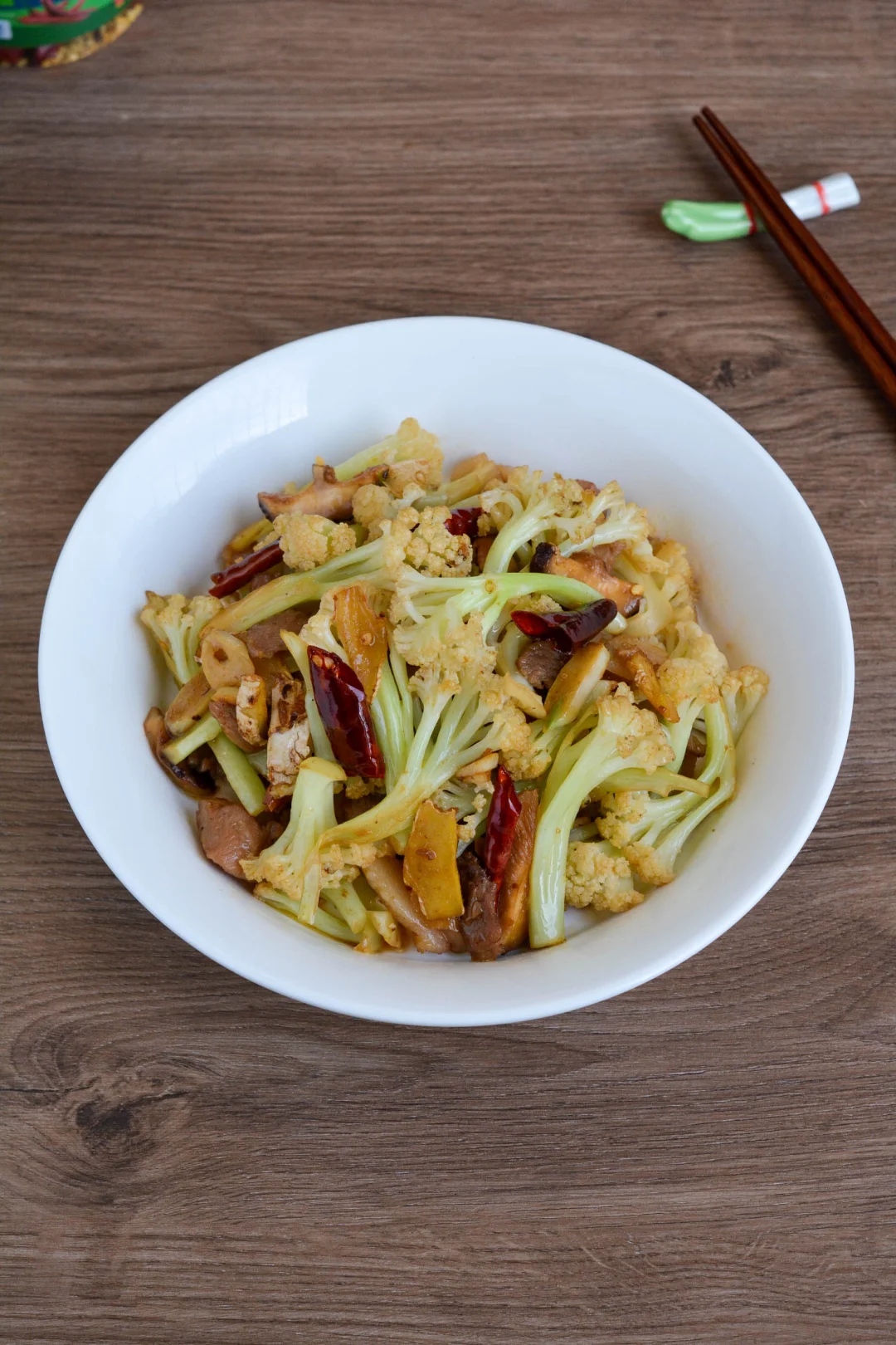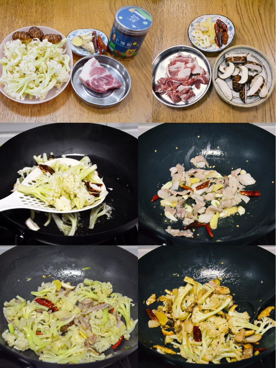 2. 梅花肉即前肩肉,炒出的油脂可使菜花更香润;配菜还可放青红辣椒等;调味料也可根据口味加大用量。
