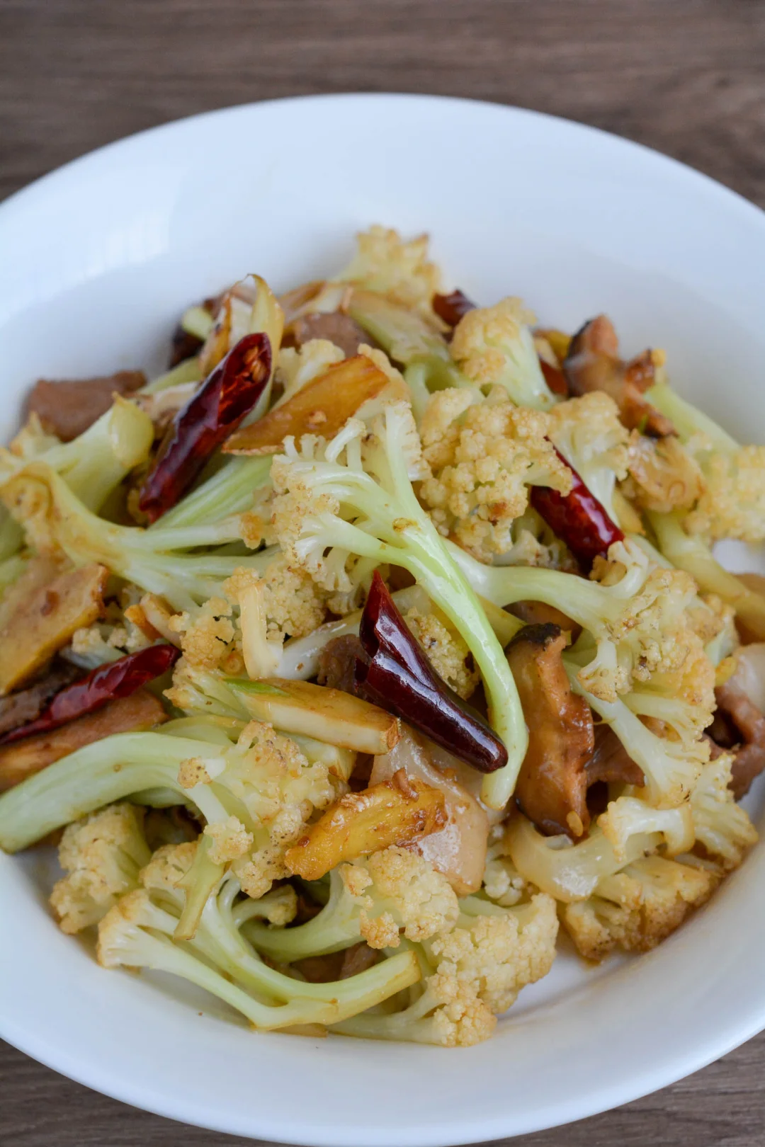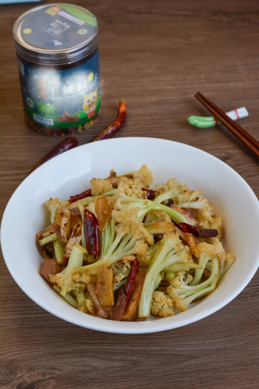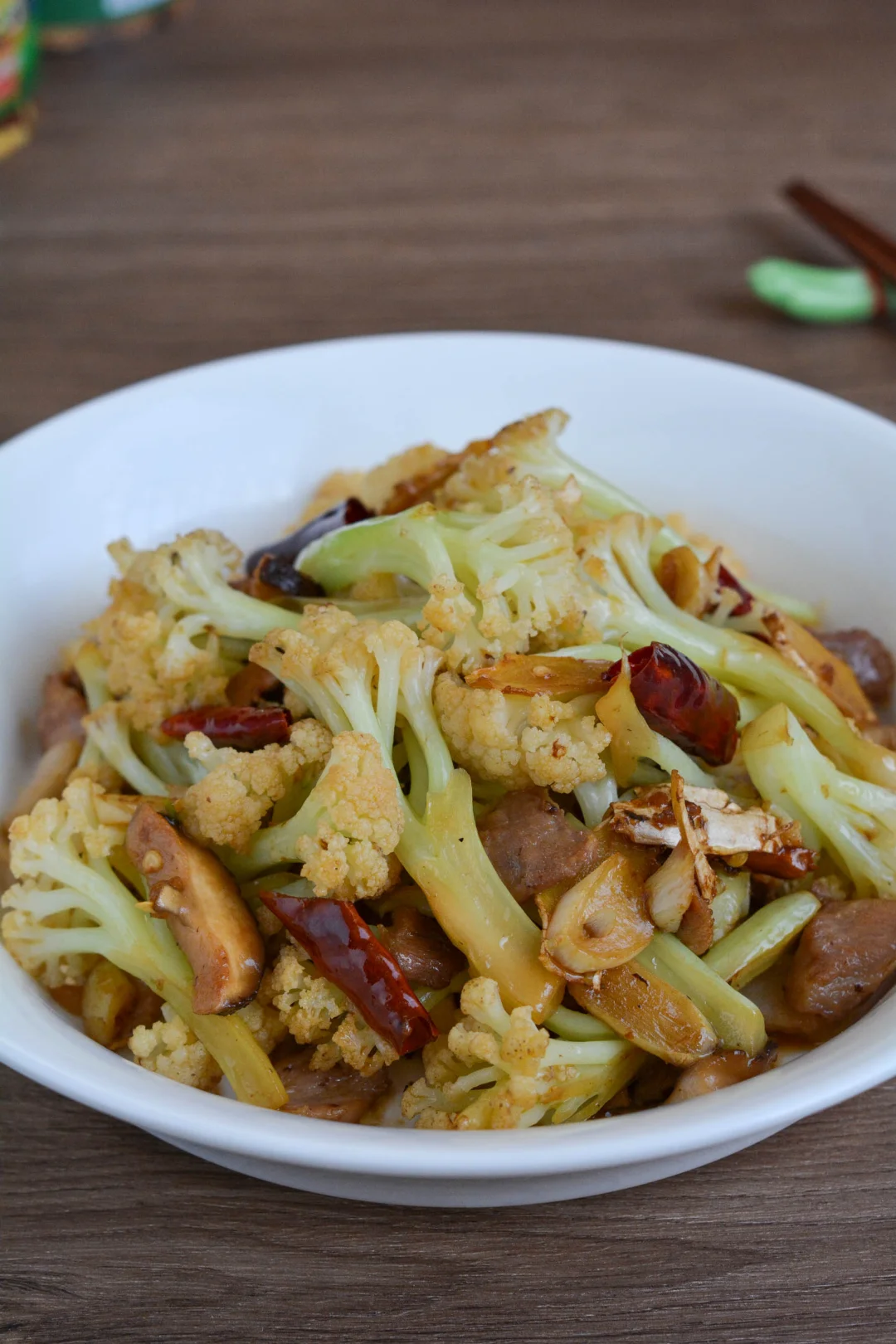 干煸菜花是一道脆嫩开胃的小炒菜,菜花中的水分被炒出,口感脆嫩;调料附着在花朵中,十分入味。做法和用料虽然简单,却又让人爱不释口。