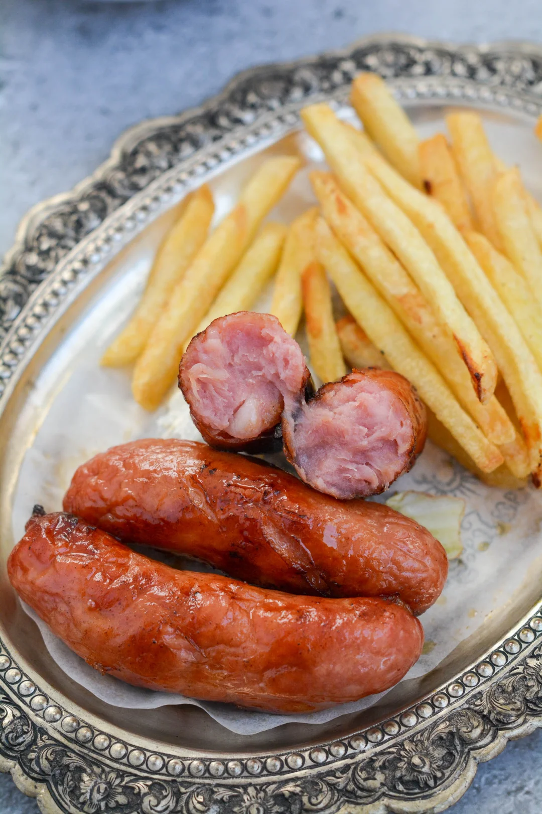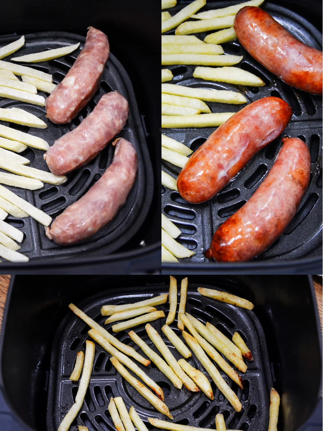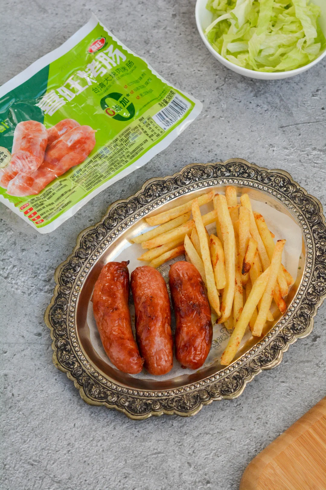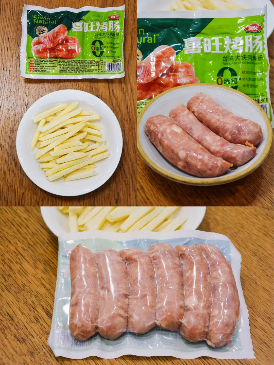 大周末的就我一人在家,搞了个轻食午餐,吃得挺美。 从冰箱冷冻室里取出原味薯条、喜旺烤肠,无需解冻,无需刷油,直接放空气炸锅里,180度先烤10分钟,再转200度转3分钟。油汪汪的烤肠看着好馋人。薯条继续烤2分钟,上色后出锅。 切2片生菜叶子补充维生素C、E和膳食纤维,午餐齐活。这款喜旺烤肠台湾大块肉烤肠选用100%猪后腿肉,提供了优质的动物蛋白质,口味微咸微甜,肉丝纤维清晰可见,没有添加甜味剂,没有防腐剂,没有淀粉,煎煮蒸烤吃法多样。薯条提供了大部分的碳水。所以这午餐看着简单,却营养均衡。