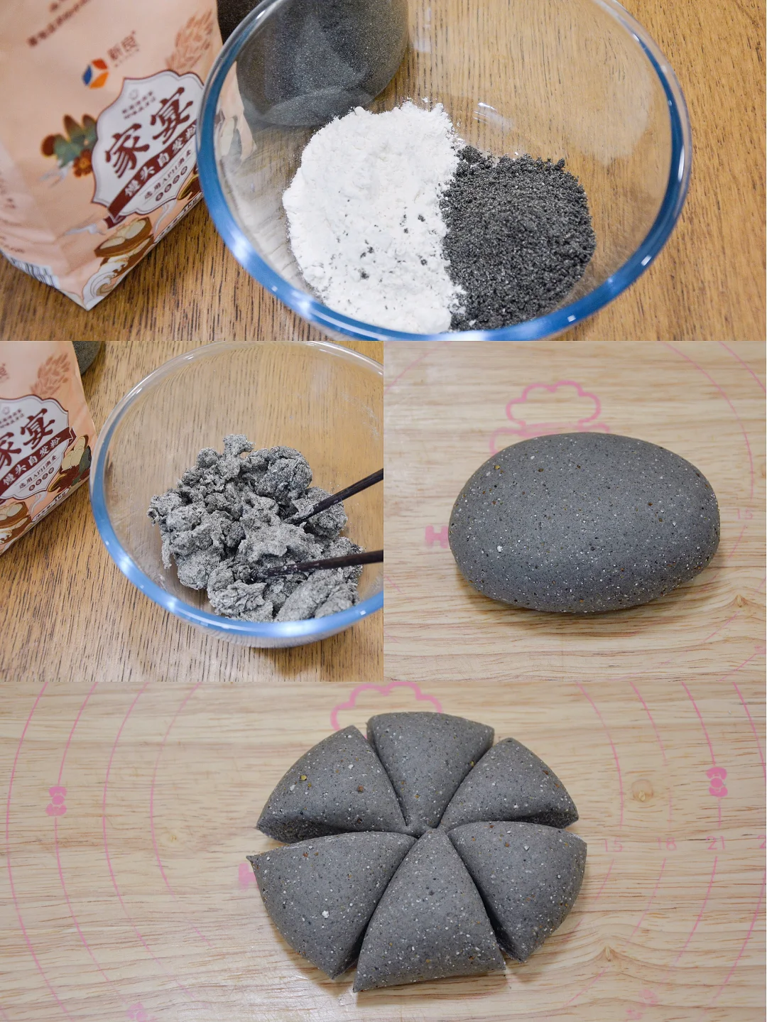 1️⃣馒头自发粉、黑芝麻粉、清水先搅拌成絮状,再揉成光滑的面团;