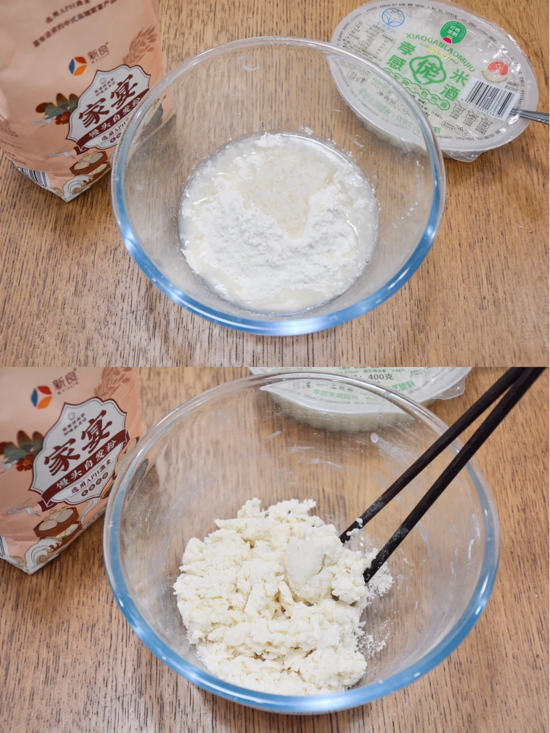 1️⃣馒头自发粉、酒酿先搅拌成絮状,再揉成光滑柔软的面团;