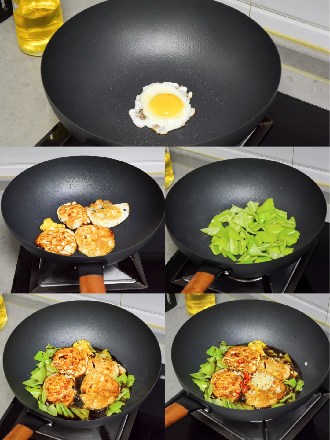 4. 炒锅加至温热,转小火,倒少许油,磕入一个鸡蛋,底部定型后翻面煎;