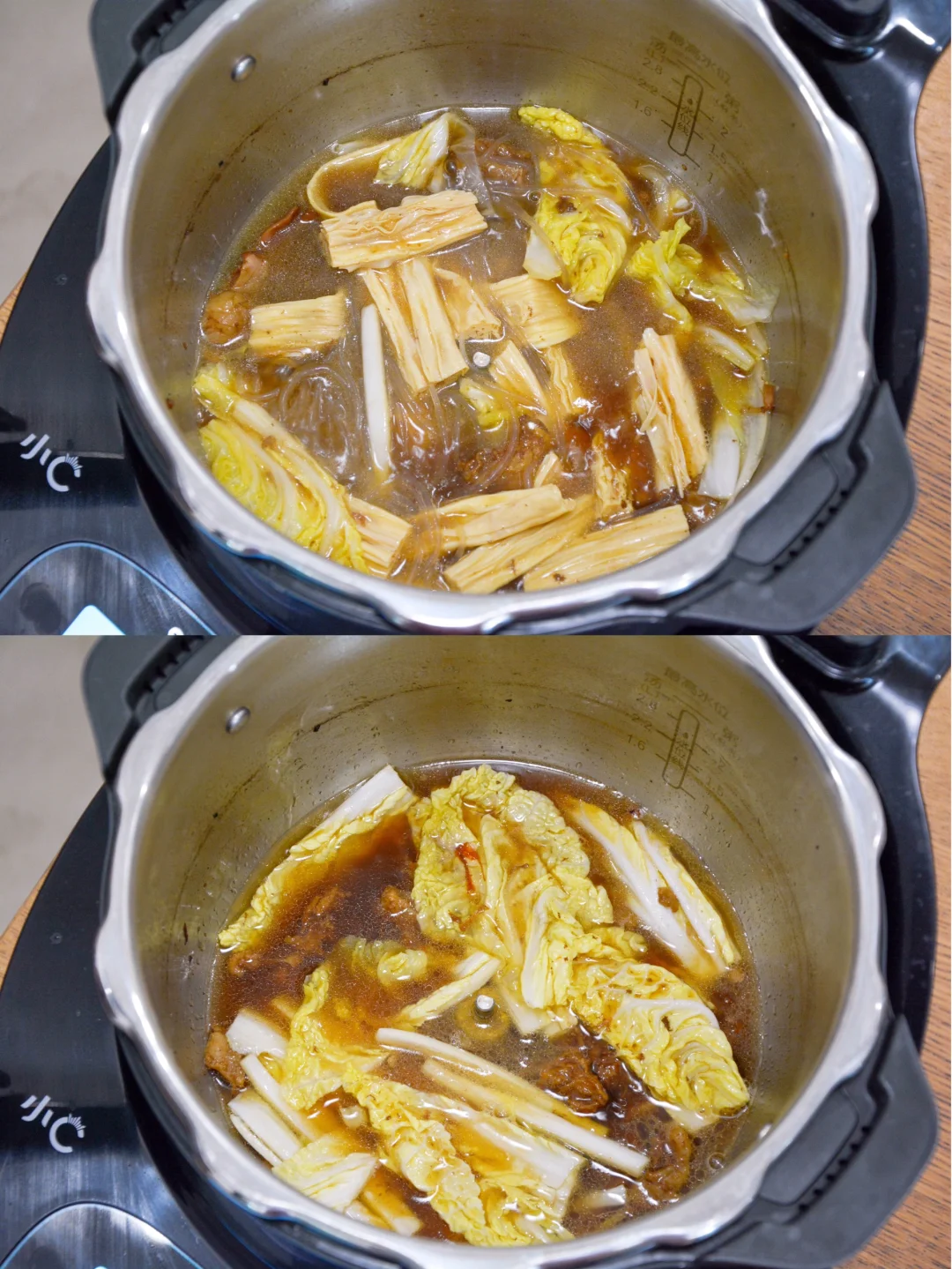 ---【牛肉汤炖白菜粉条】--- 用肉汤炖菜太好吃了,尤其是炖肉时多放些汤,汤盛出来后再一把泡软的粉条和白菜叶,炖几分钟就是香喷喷的炖菜,有了肉汤的加持,简直不要太好吃! 上次用高压锅炖牛肋条,多放了一些汤,把肉和部分肉汤盛出来大块朵颐,剩下的放了提前泡软的腐竹、粉条、白菜,炖了5分钟,美味端上桌,比牛肉还受欢迎。 依此做法,炖排骨、五花肉、炖鸡、炖鸭,甚至炖少刺的鱼虾时,都可以这样做,吸足了浓汤的腐竹和粉条,尤其好吃。