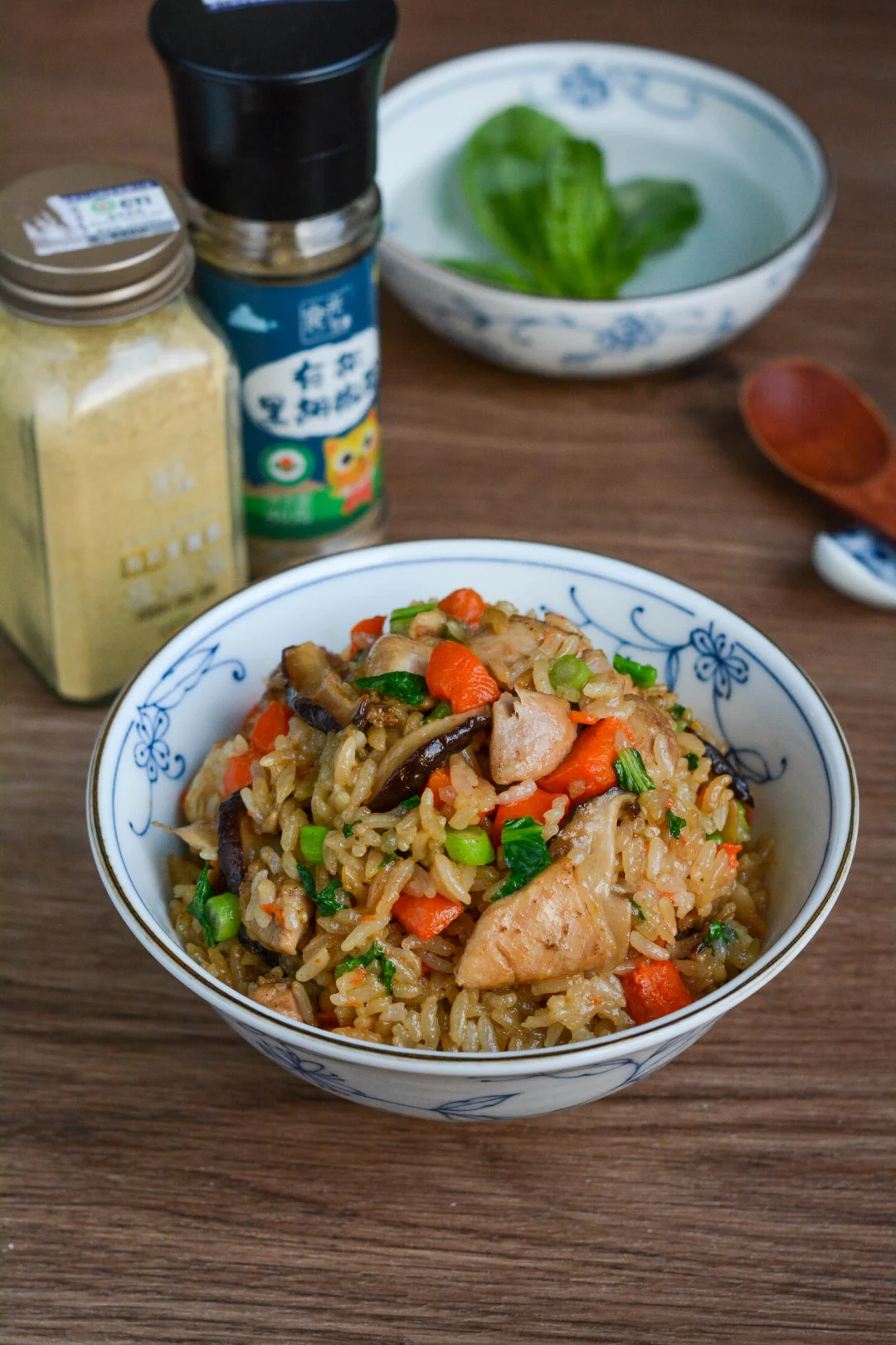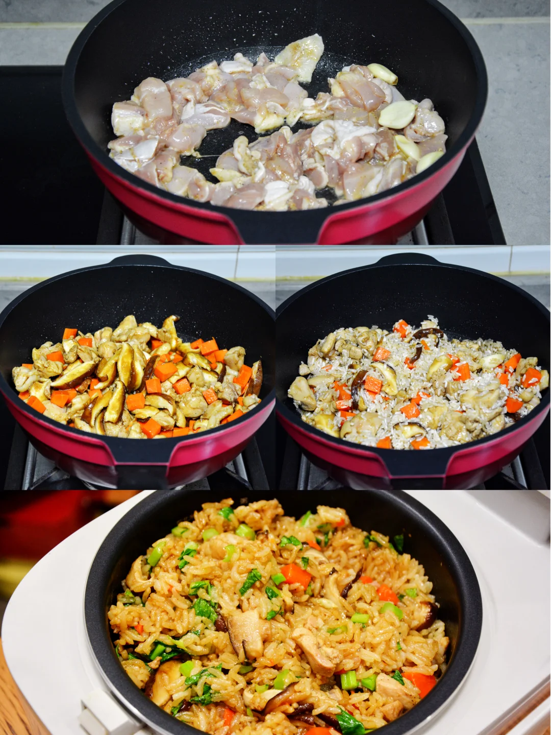 这锅焖饭简单易做,营养美味。鸡腿肉香嫩,香菇滑嫩,米饭吸足了肉脂和肉汁,鲜美油润;点缀其中的胡萝卜和青菜碎,增加了微甜、清新的口感,一点儿都不觉得油腻。