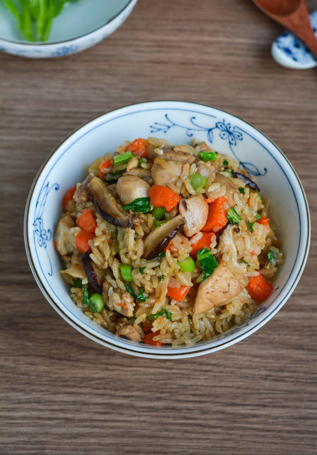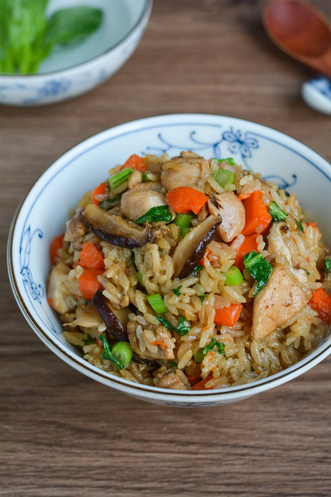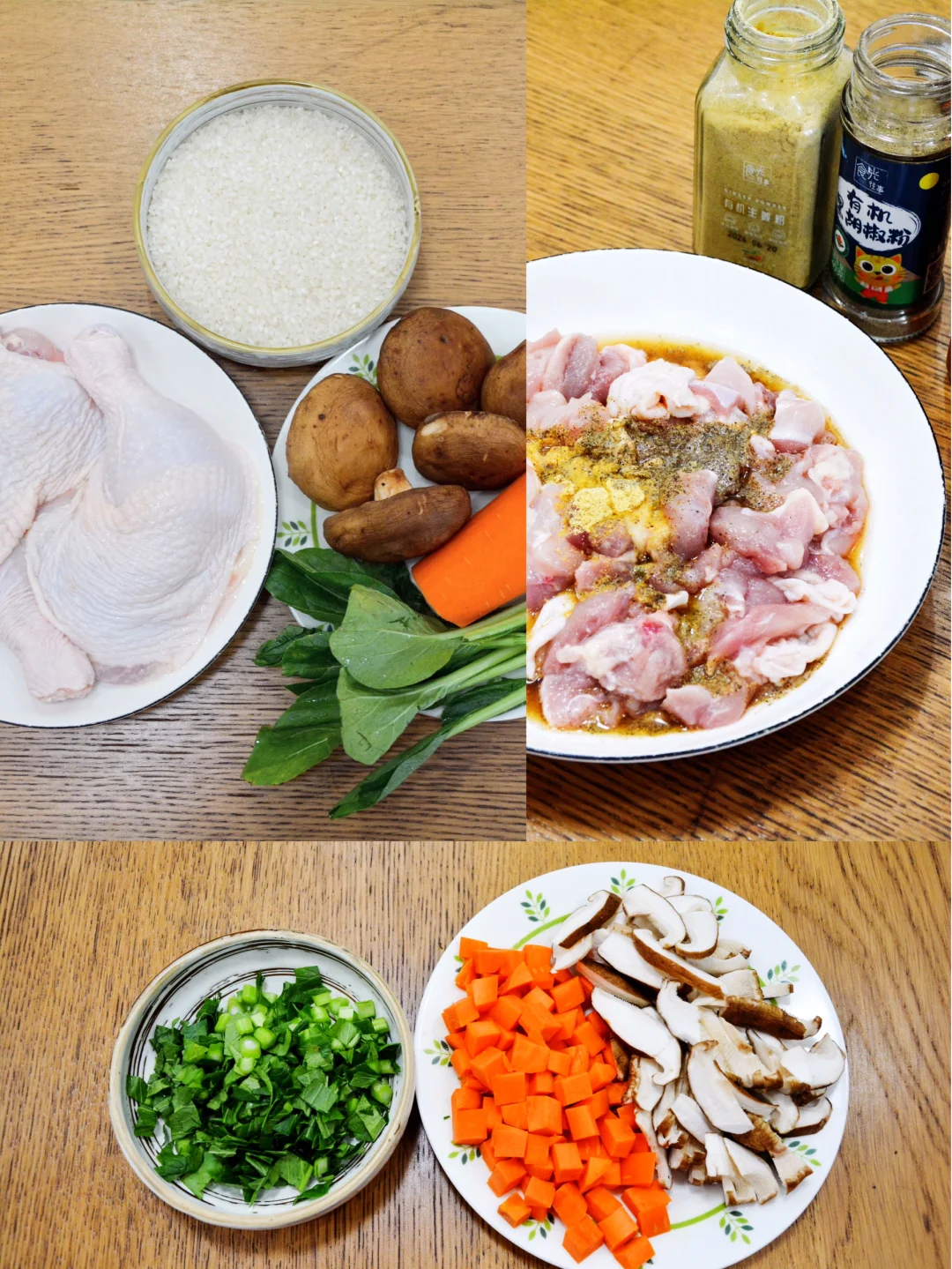 【材料】 大米2杯,鸡腿肉300克,鲜香菇5朵,胡萝卜半根,油菜心5棵